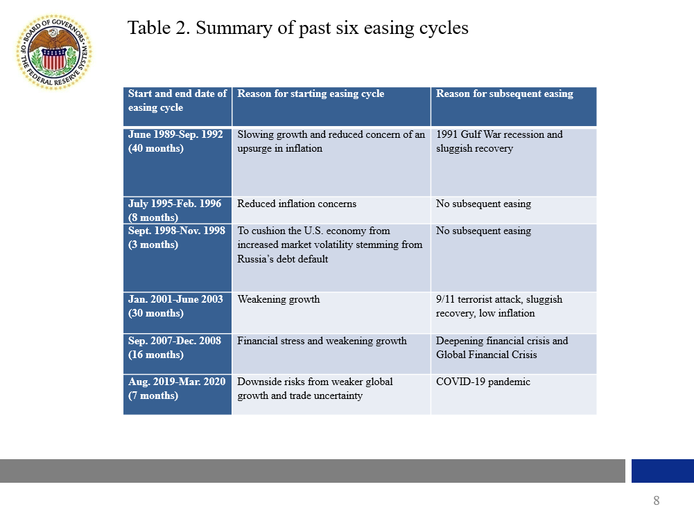 Looking at table 2, two facts stand out. First, most easing cycles start because of concern about slowing economic growth. In table 2, the one exception is the easing cycle that started in July 1995 and is associated with what Alan Blinder (2023) has labeled a "perfect soft landing" example.4 That particular easing cycle started predominantly because of reduced inflation concerns. All the other easing cycles started because either there was a concern about slowing economic growth, or, in one case, because there was a concern about slowing economic growth and there were reduced inflation concerns.