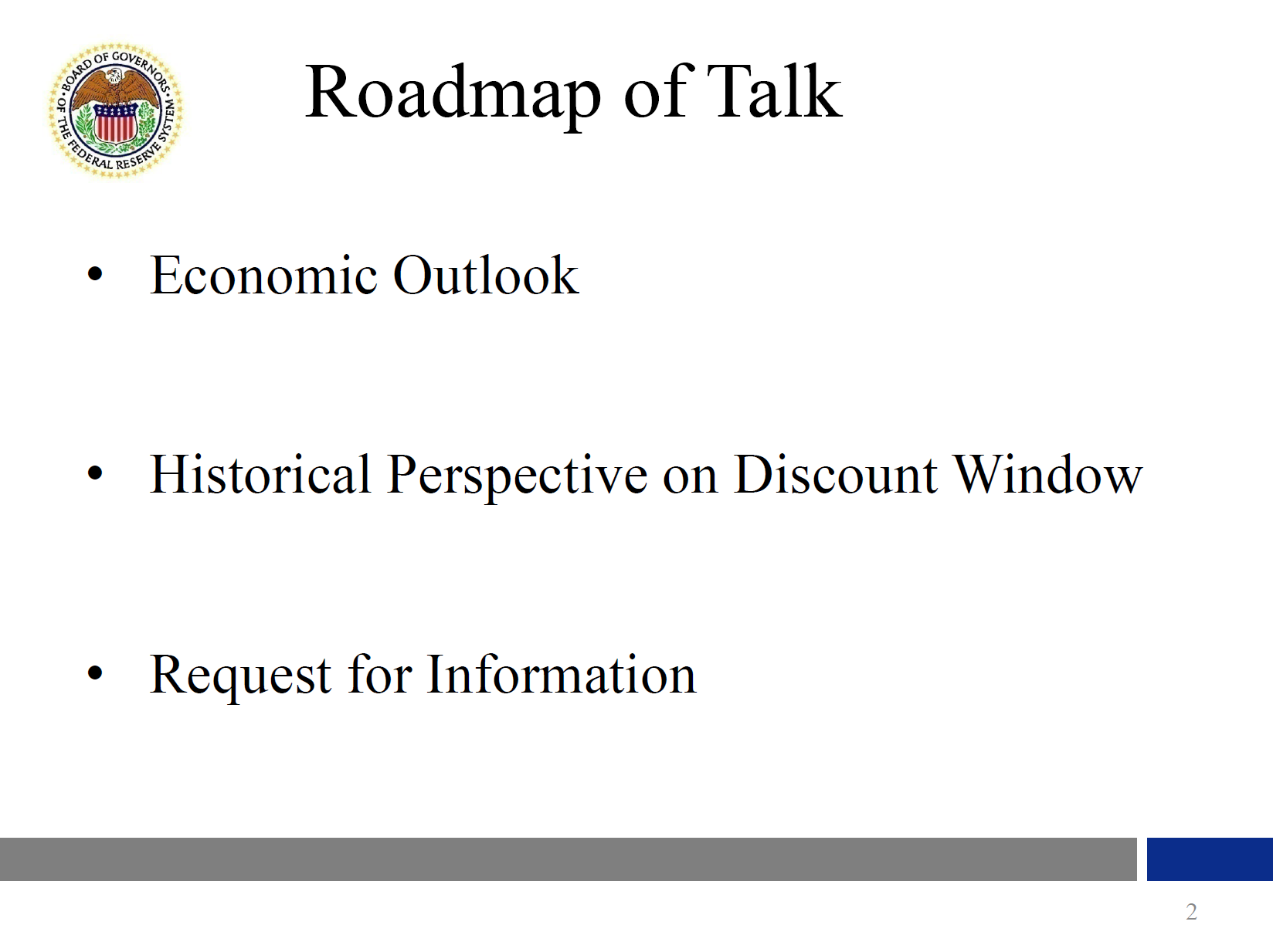 Today, I will do three things. First, I will discuss briefly my outlook for the U.S. economy. Second, I will offer my historical perspective on the discount window, starting in 1913 and ending in 2000. Finally, I will provide a few details about the request for information the Fed recently published.