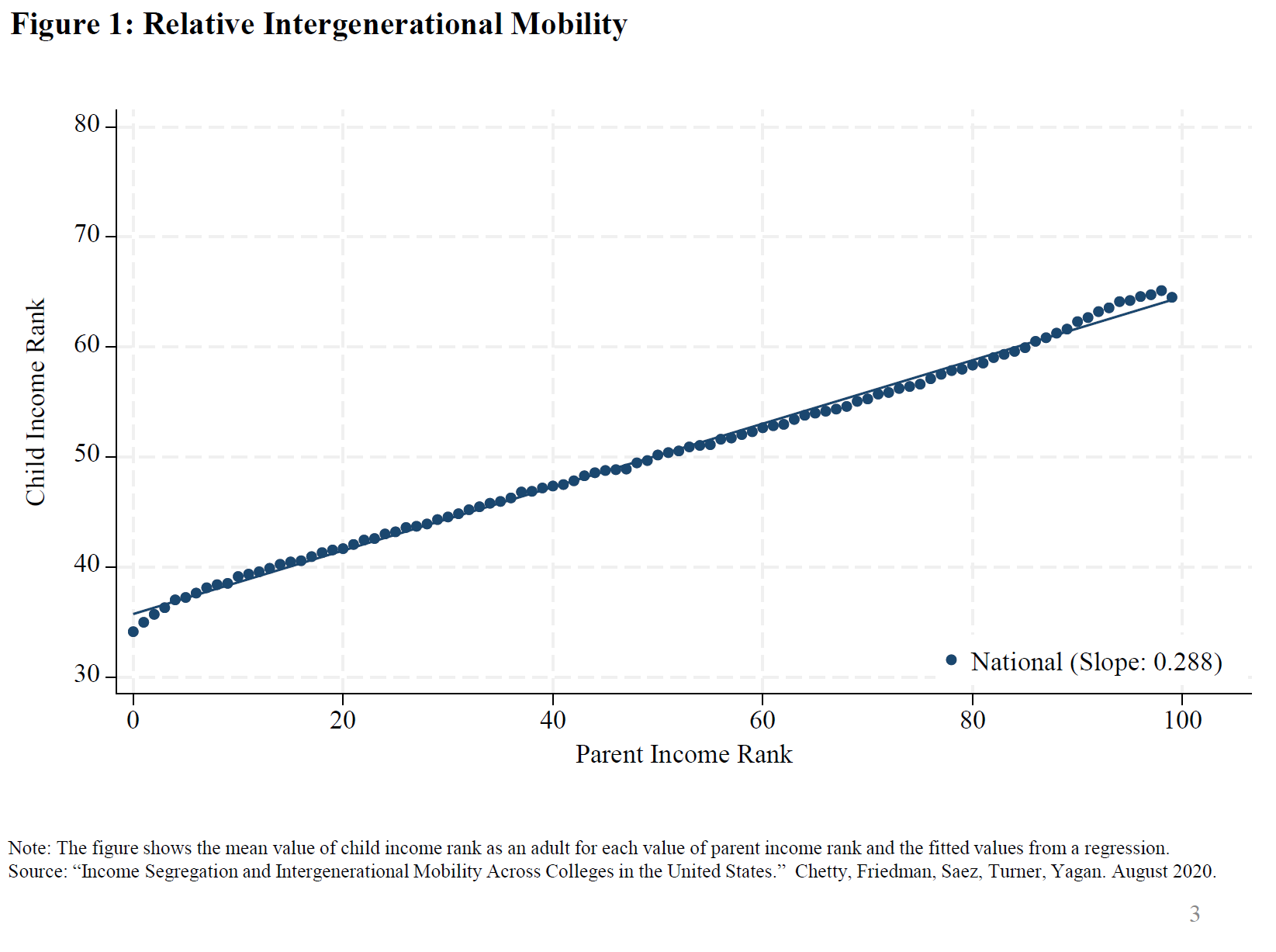 With these sentiments of what Americans and policymakers think and feel about mobility in mind, let me turn to some evidence on economic mobility in the U.S. One common way to measure economic mobility is to relate an individual's income in adulthood to their family income during childhood. The measure I am showing here—from Harvard economist Raj Chetty and coauthors—is likely familiar to many of you.4 It shows a relative intergenerational mobility measure, also known as the "rank–rank" relationship. This measure relates a child's ranking in the income distribution as an adult, shown on the vertical axis, to the child's family income rank during childhood, shown on the horizontal axis.