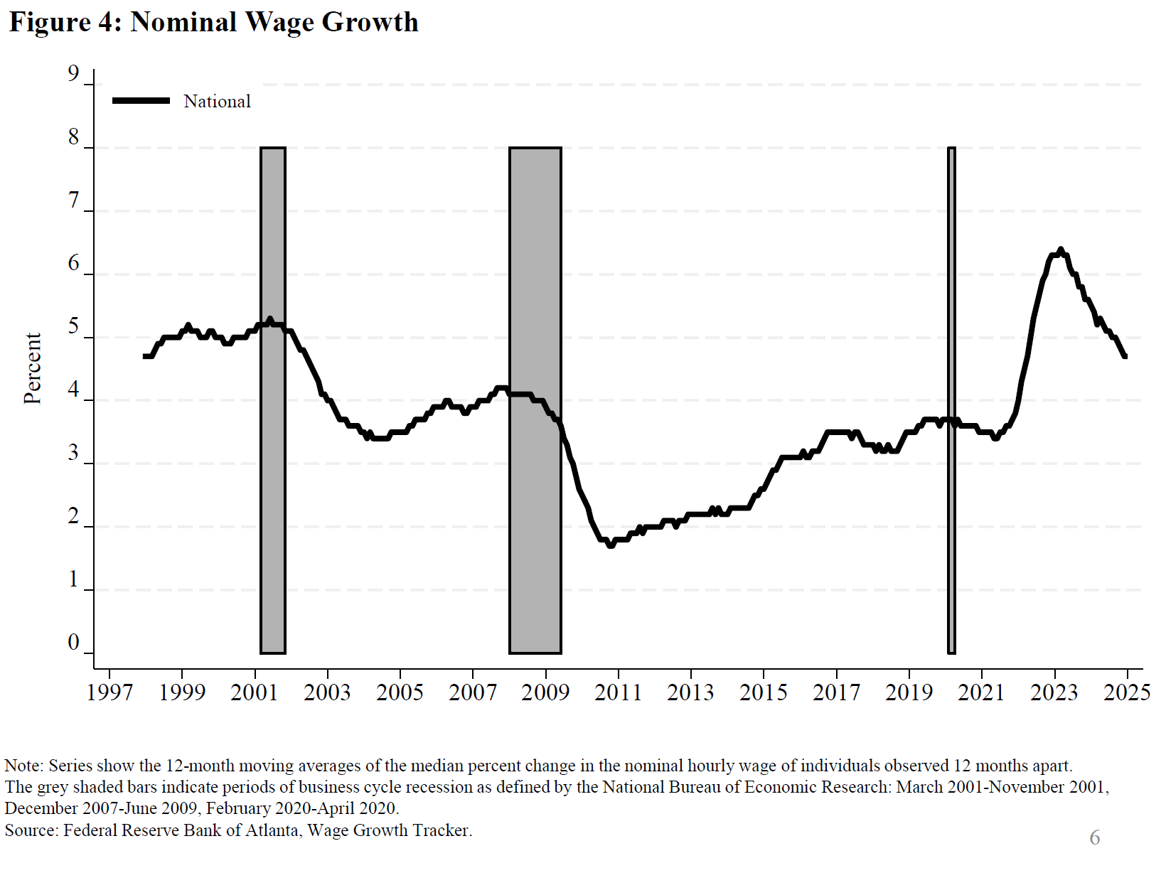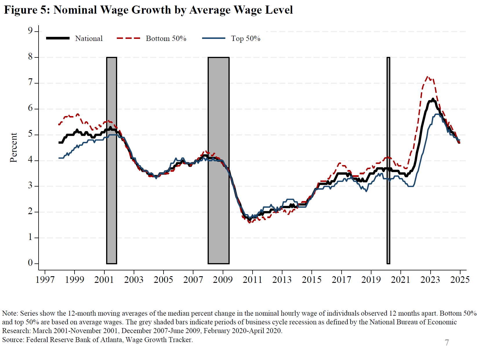 11. Nominal wages in the figure are measured by the Atlanta Fed's Wage Growth Tracker. Series show 12-month moving averages of the median percent change in the nominal hourly wage of individuals observed 12 months apart. Workers are assigned to wage quantiles based on the average of their wage reports in both the Current Population Survey and outgoing rotation group interviews. Workers in the lowest 50 percent of the average wage distribution are assigned to the bottom half, and those in the top 50 percent are assigned to the top half. Return to text