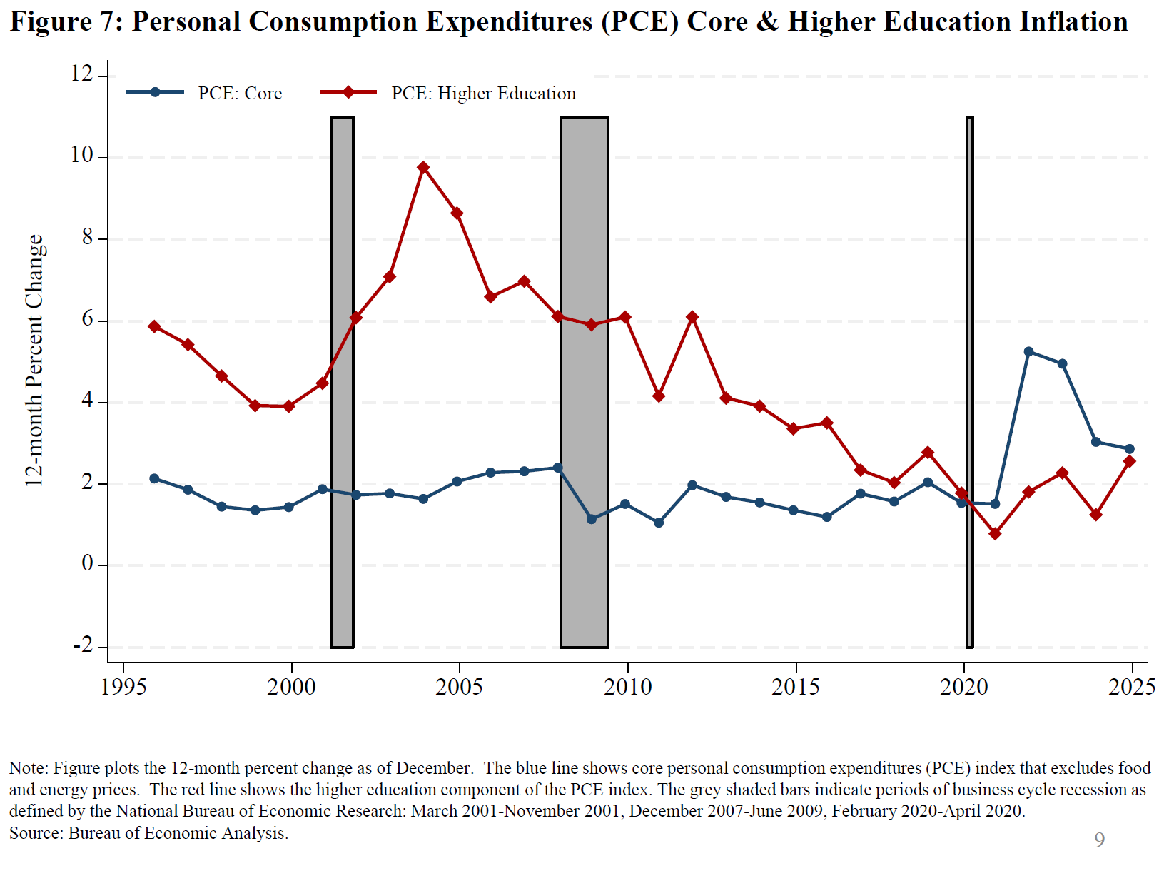 I want to highlight one of these major expenses—higher education—as attending college is an important pathway for upward mobility. Looking at figure 7, higher education inflation is shown by the red line. A variety of factors affect the cost of college generally, including student loan costs, state funding, and administrative overhead. Nonetheless, when inflation was low for an extended period during the economic expansion that followed the GFC, we also saw a moderation in the growth of higher education costs.12