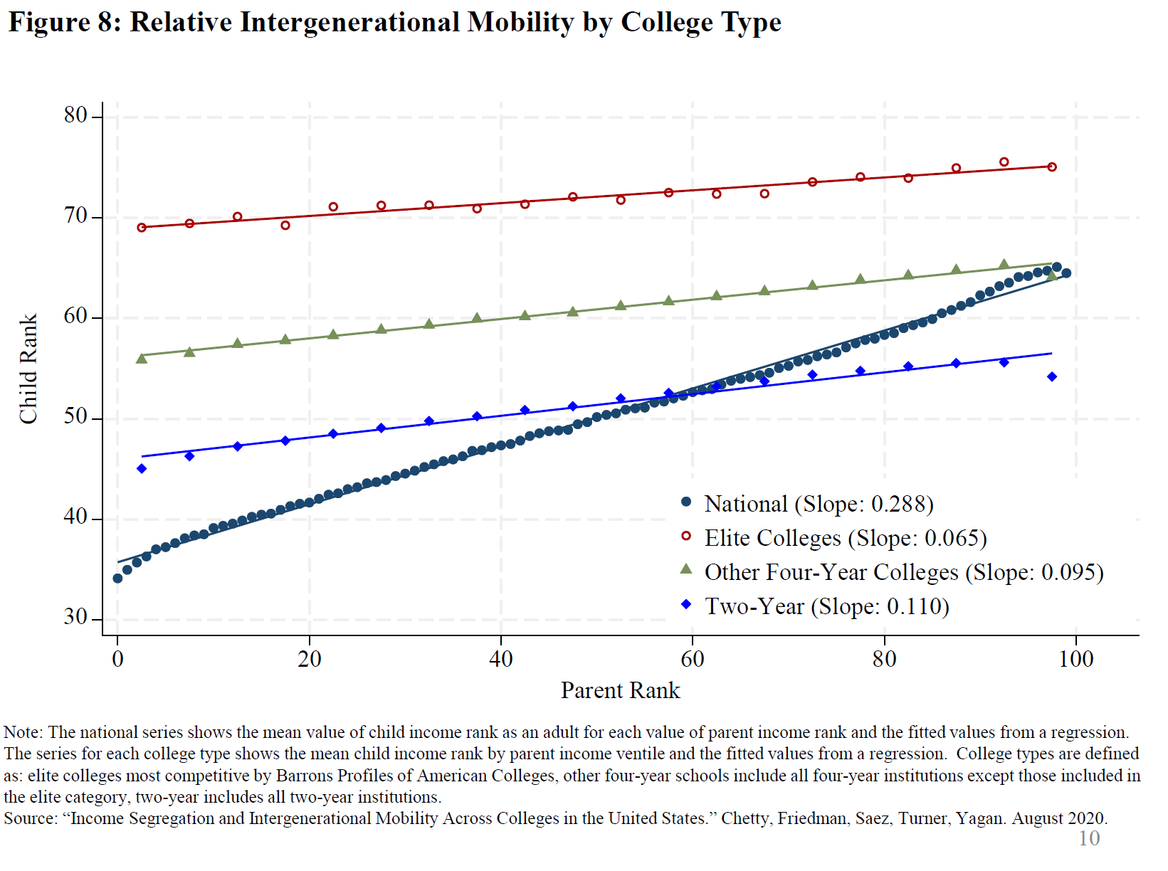 The flatter slope indicates that outcomes for children from lower-income families are more similar to outcomes for children from higher-income families within each college type than they are overall. In this way, higher education is an important source of upward mobility for many youths and a pathway to a more secure financial future. Of course, the relatively steeper national relationship holds because there are meaningful differences in college enrollment over the family income distribution.