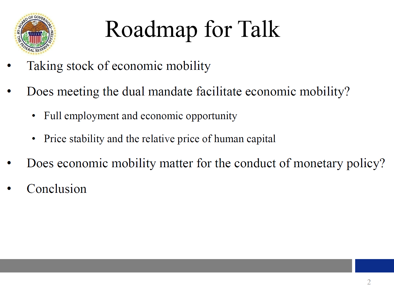 As monetary policymakers, my colleagues and I on the Federal Open Market Committee do not have direct control over economic mobility in the U.S. Our key monetary policy tools are not designed to address this issue, nor is economic mobility part of our mandate. However, our dual mandate of maximum employment and price stability has implications for a wide range of economic outcomes, including economic mobility. This leads to many important questions about the relationship between the dual mandate and economic mobility. In my remarks, I want to address two such questions. First, does meeting the dual mandate facilitate economic mobility? And second, does economic mobility matter for the conduct of monetary policy?