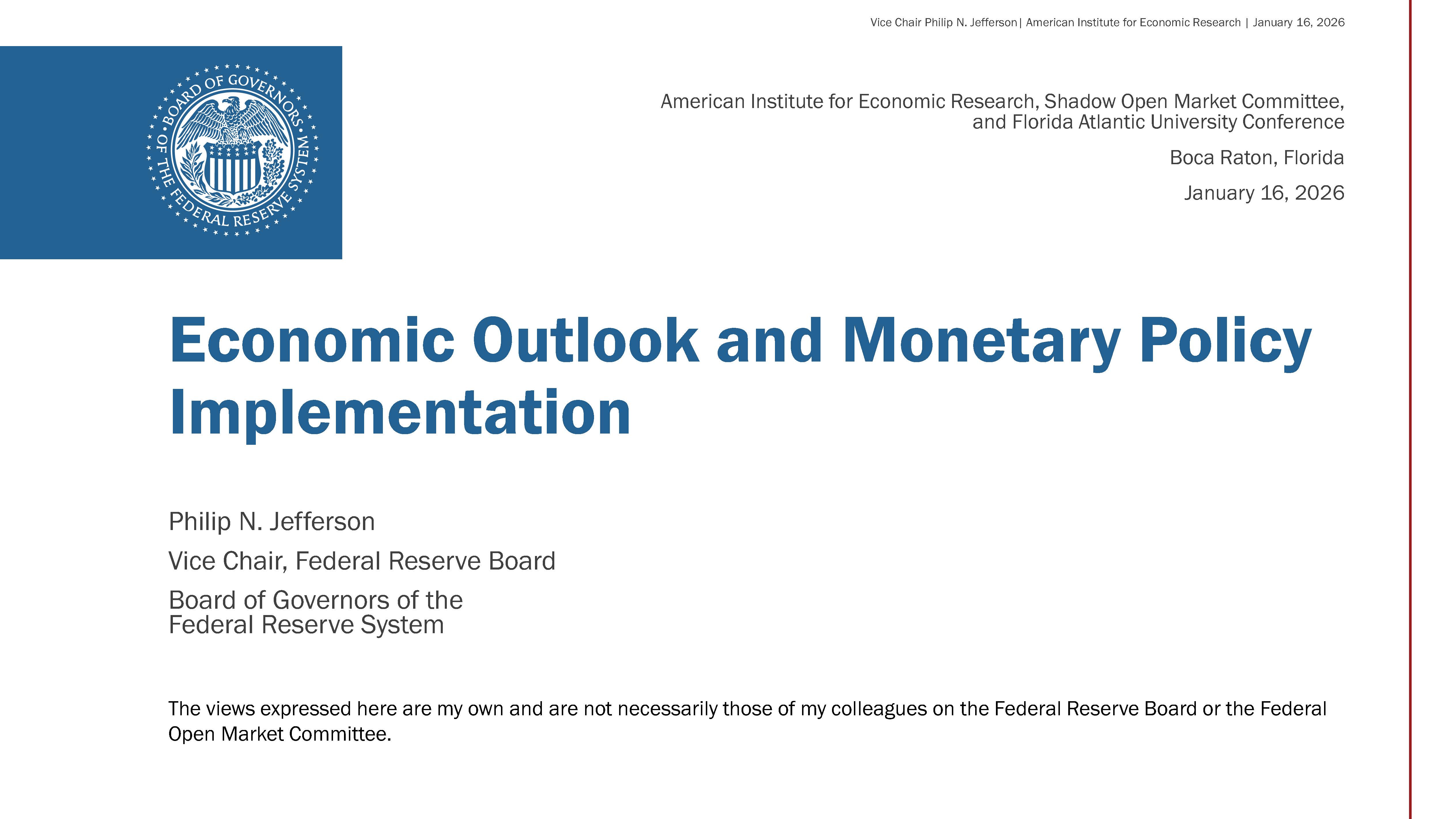 Thank you, President Hasner, for the kind introduction. It is an honor to speak at Florida Atlantic University, and I am glad to have the chance to talk with those here from the American Institute for Economic Research and the Shadow Open Market Committee.