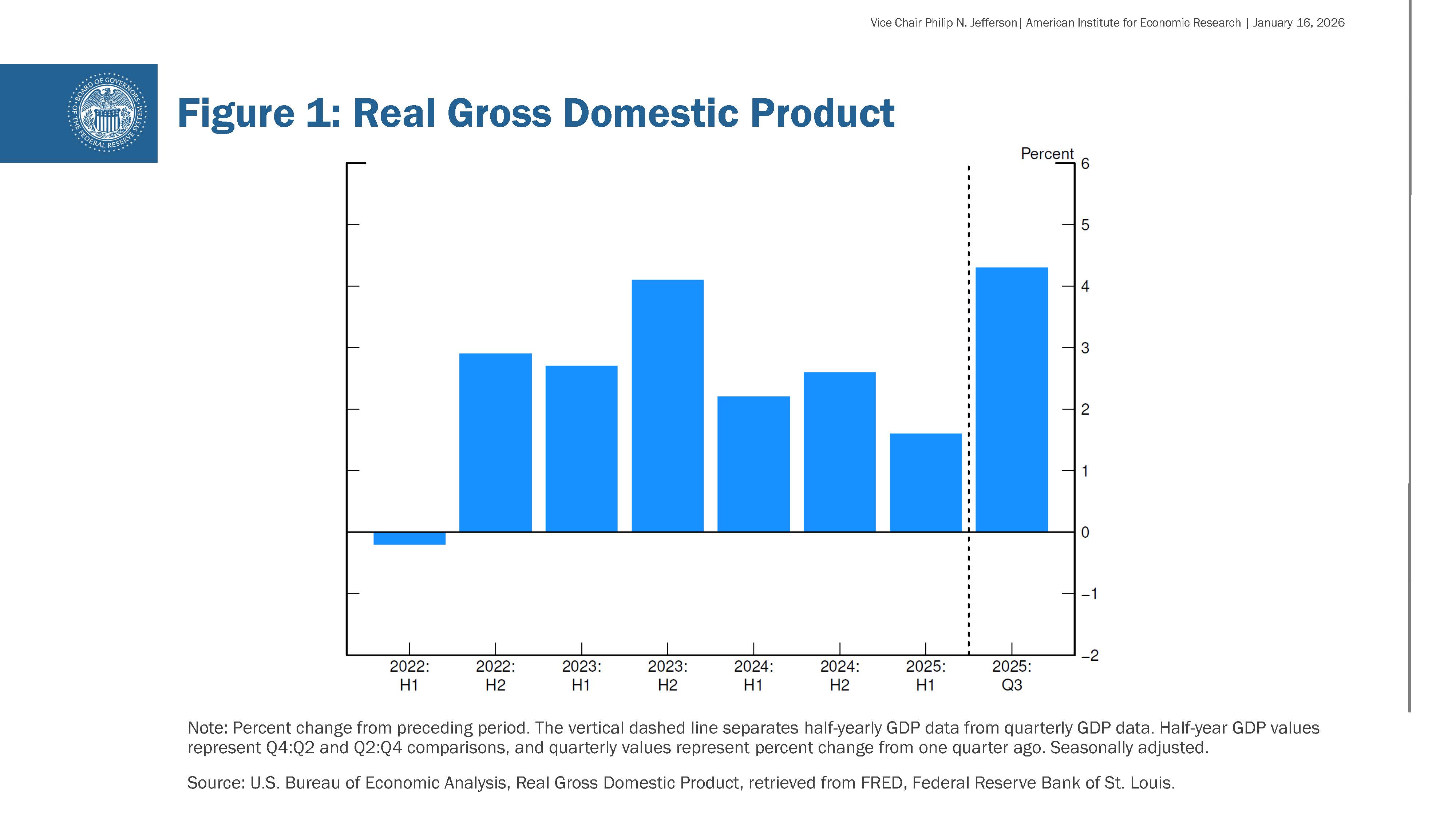 I am starting 2026 with a cautiously optimistic point of view. Conditions in the labor market appear to be stabilizing, and I see the economy as well positioned to continue to grow while inflation returns to a pathway toward our 2 percent objective. The most recent data indicate that economic activity has remained strong. In the third quarter of 2025, gross domestic product rose at an annual rate of 4.3 percent. As you can see in figure 1, that was a sharp acceleration from the first half of last year, mostly reflecting strong consumer spending and an upward swing in net exports, which can be volatile. Business investment grew at a solid rate in the third quarter, while residential investment continued to be soft. Fourth-quarter growth is likely to be restrained due to the effects of the government shutdown. Still, excluding those effects, I see the economy expanding at a solid pace of about 2 percent in the near term.