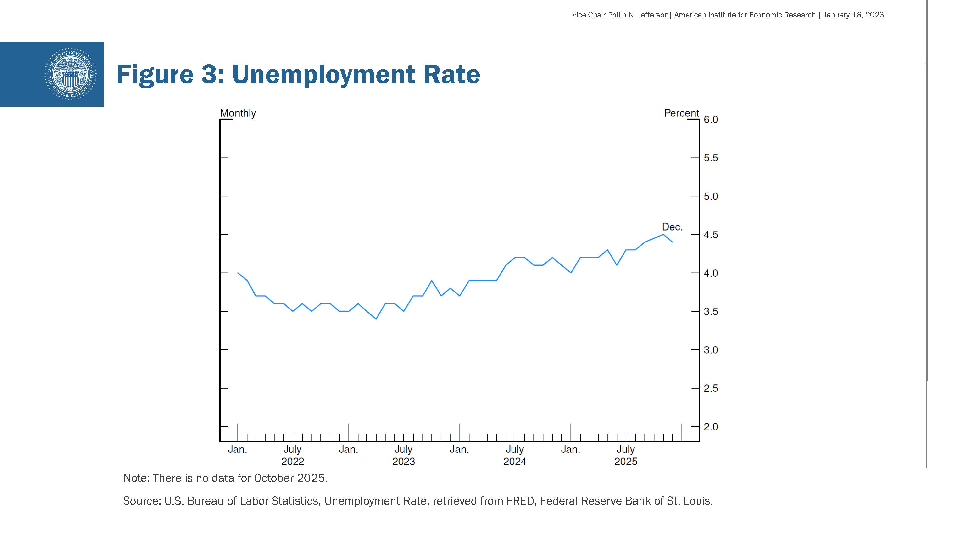 Looking at the labor market, job growth moderated last year, and the unemployment rate edged higher. In November and December, employers added about 50,000 jobs to payrolls each month, as you can see in figure 2. This came after payrolls declined in October, largely due to an unusually large number of separations from the federal government. However, even setting aside October, the broader trend last year showed slower job creation than in 2024. At least part of the slowdown in the job market reflects a decline in the growth of the labor force due to lower immigration and labor force participation. However, labor demand has softened as well. Meanwhile, the unemployment rate, shown in figure 3, ended the year at 4.4 percent, up modestly from 4.1 percent at the end of the previous year.