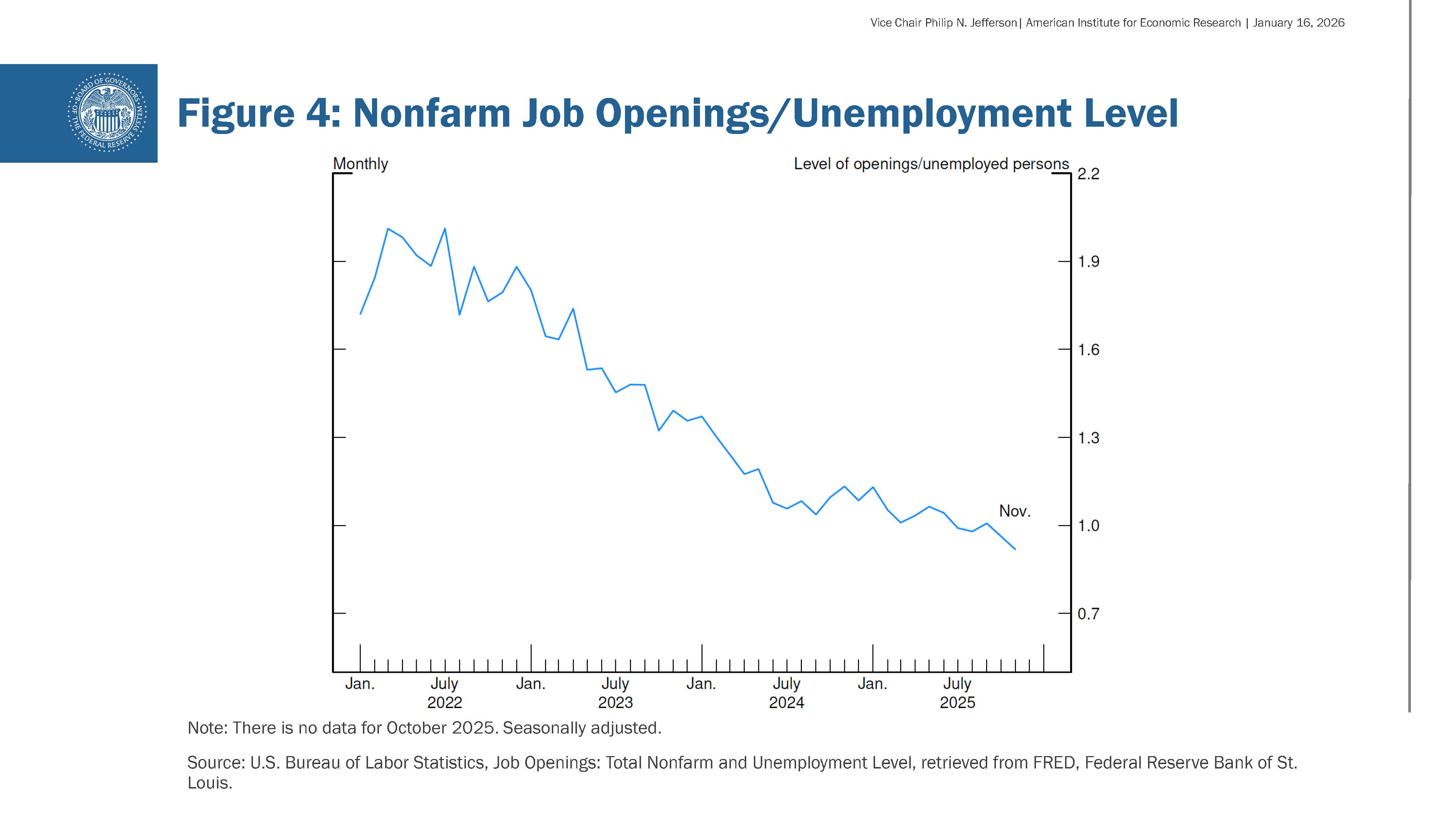 That said, the labor market is not deteriorating rapidly, as layoffs remain low; however, hiring remains low as well. Figure 4 shows that there were 0.9 available jobs in November for every unemployed American seeking work. While that level is normally consistent with a solid labor market, the ratio is considerably lower than a few years ago, when labor market conditions were much tighter early in the pandemic recovery. In this less dynamic and somewhat softer labor market, the downside risks to employment appear to have risen. My baseline, however, is for the unemployment rate to hold steady throughout this year.
