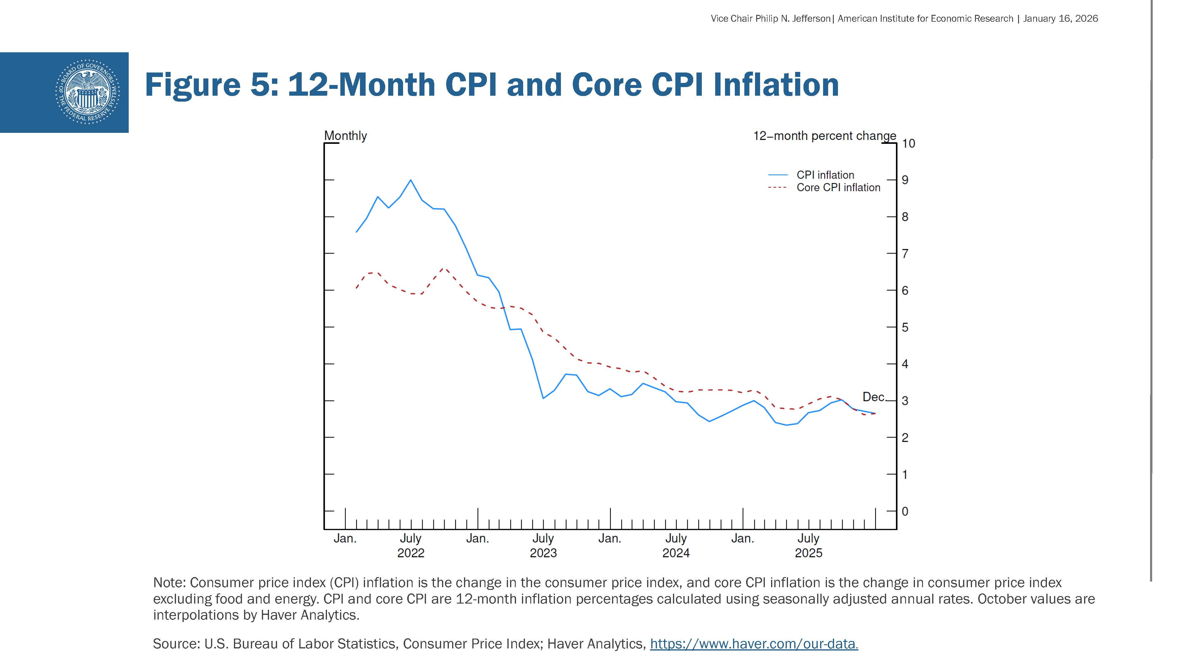Considering the other part of our dual mandate, inflation remains somewhat elevated from our 2 percent goal. As you know, the Federal Open Market Committee (FOMC) targets the rate of increase in the personal consumption expenditures (PCE) price index; however, due to the government shutdown, the most recent available PCE price data are for September 2025. For this reason, I find it informative to review consumer price index (CPI) data to get a timelier sense of the direction of inflation, even if it does not directly translate to our inflation target. Over the longer term, both CPI and PCE measures tell a similar story. Data released earlier this week showed that the CPI rose 2.7 percent over the 12 months ending in December, the same rate as November. Core CPI, which excludes food and energy prices, rose 2.6 percent, also matching November's reading. You can see in figure 5 that both headline and core measures of inflation have eased significantly from their highs in mid-2022. However, that progress slowed over the past year or so, and inflation remains at a level that is above readings consistent with our inflation target.