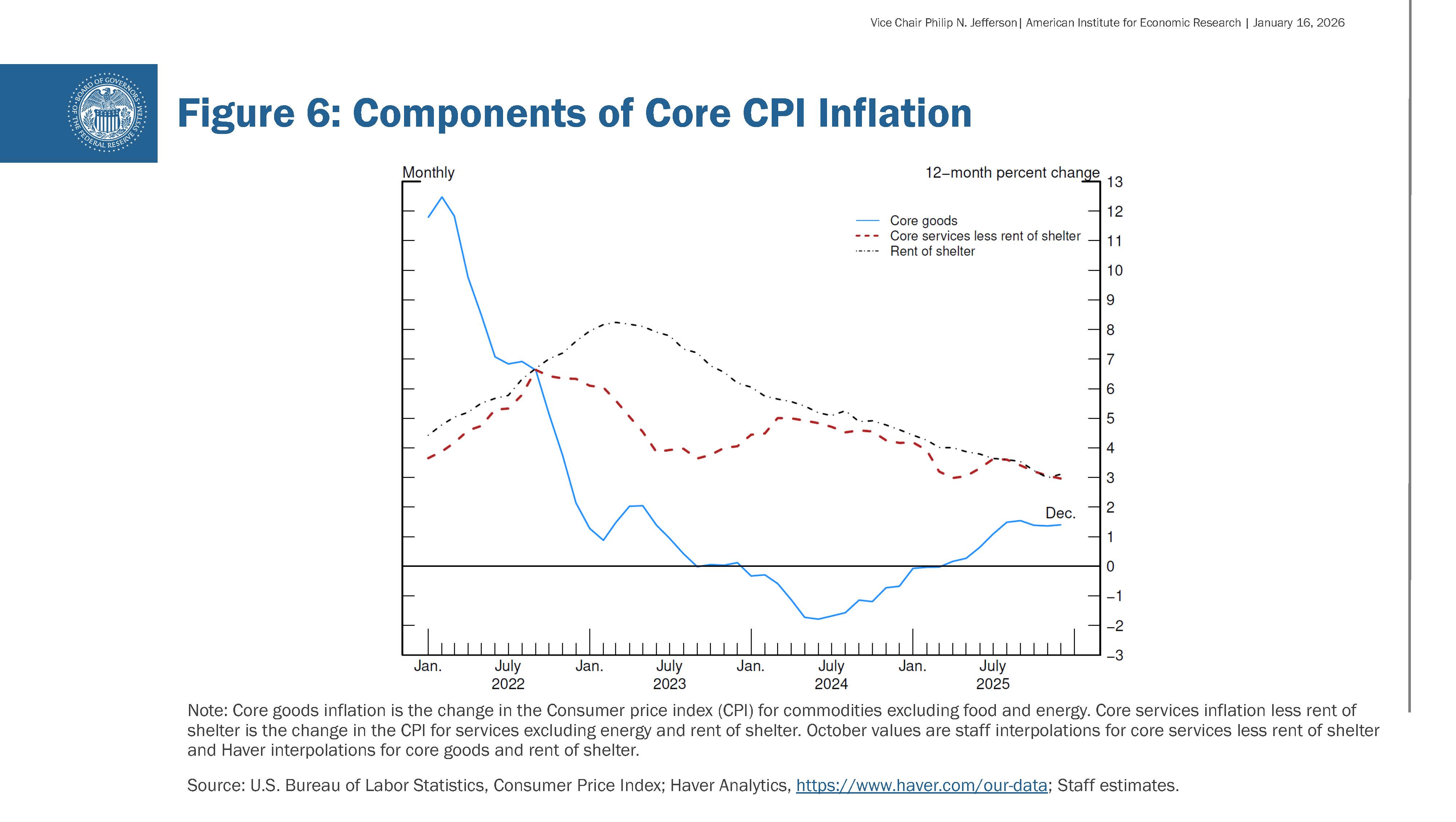 Looking at the subcomponents of core CPI, shown in figure 6, we can see why there has been a slowdown in the pace of disinflation. Over the past year, we have seen further notable declines in services inflation—rent of shelter as well as other non-energy services—but these have been offset by an increase in core goods price inflation. Looking at the three buckets separately, shelter inflation, shown by the black dot-dashed line, has continued to decline, and core services inflation excluding shelter, the red dashed line, has also been on a downward trend, albeit on a somewhat bumpier path. Those readings are consistent with overall inflation moving back toward our target. What is inconsistent with a return to 2 percent inflation is the rise in core good prices. Following very high readings during the pandemic, goods inflation fell sharply, reaching its pre-pandemic range in 2023, and fluctuated roughly in that range until 2025. Last year, core goods price inflation picked up markedly, to 1.4 percent over the 12 months ending in December 2025, at least in part reflecting increased tariffs filtering through to certain goods prices.