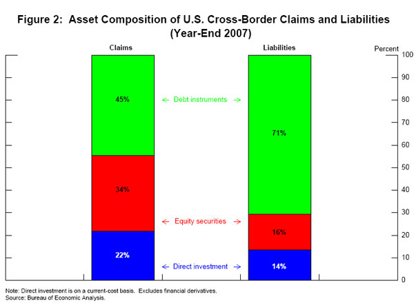 Second, within these enormous gross positions is a great variety of types of claims and liabilities, including many forms of direct investment, equity securities, and debt instruments.1 (See figure 2.) The composition of U.S. liabilities is quite different than the composition of U.S. claims on the rest of the world. For example, more than two-thirds of U.S. liabilities are in the form of debt instruments, while over half of U.S. claims are in equity securities and direct investment. Some call this the “venture capitalist” nature of the U.S. external position: U.S. investments abroad tend to be concentrated in relatively risky equity instruments, but liabilities of the United States tend to be in low-volatility debt instruments.