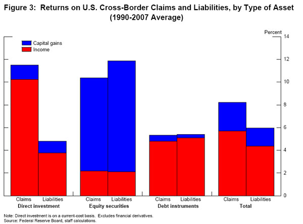 Third, the different asset classes tend to have different rates of return for both capital gains and income. (See figure 3.) The return on equity securities (both claims and liabilities), for instance, is mainly from capital gains, while the return on debt instruments and direct investment is primarily from income. For debt and equity securities, the income return and the rate of capital gain on U.S. claims are roughly the same as those on U.S. liabilities. This is not true, however, for direct investment: The income return on direct investment by the United States in other countries is more than twice as high as the income return foreigners receive on their direct investment in the United States. Taking into account the differences in returns and the differences in the composition of assets, the total return on U.S. claims turns out to be about 2 percentage points per year higher than the return that the United States pays on its liabilities to the rest of the world.
