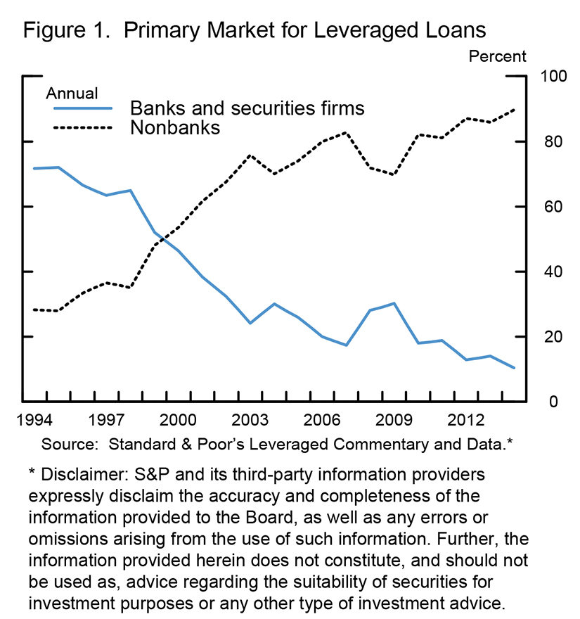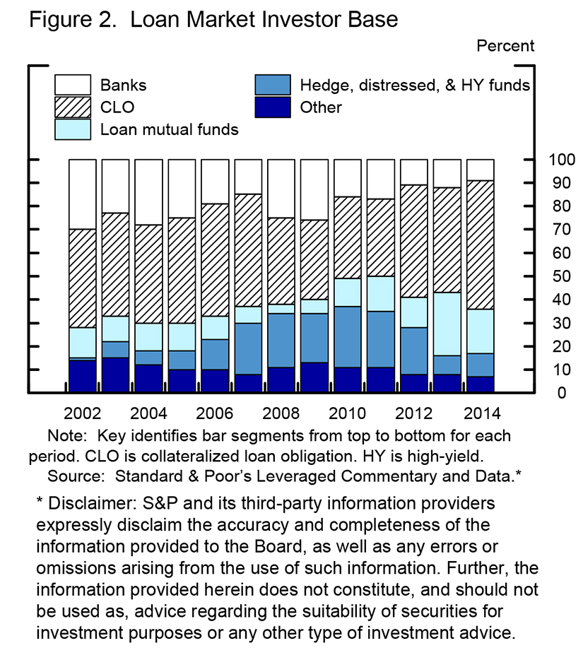 The term portions of leveraged loans are typically not held in the arranging banks' portfolios, but rather sold to a wide range of institutional investors--collateralized loan obligations (CLOs), retail loan funds, pension funds, insurance companies, hedge funds, and others (figures 1 and 2). This "originate-to-distribute" model is now dominant across a range of markets and reflects the movement over several decades of credit intermediation from portfolio lending (from the firm's perspective, the "storage business") to the capital markets (the "moving business"). This practice transfers and disperses credit and liquidity risks from the core of the financial sector to capital market investors that are willing to bear such risks for what they deem appropriate compensation. While the risks do not disappear, the system can, in principle, be safer if the ultimate institutional investors pose lower risk to the system than banks. For example, movement of credit exposure to speculative grade firms from a bank's balance sheet to a vehicle that is stably funded by sophisticated, deep-pocket institutional investors could be a net gain to financial stability. Movement of such loans to a highly leveraged, runnable vehicle beyond the regulatory perimeter could have the opposite effect.