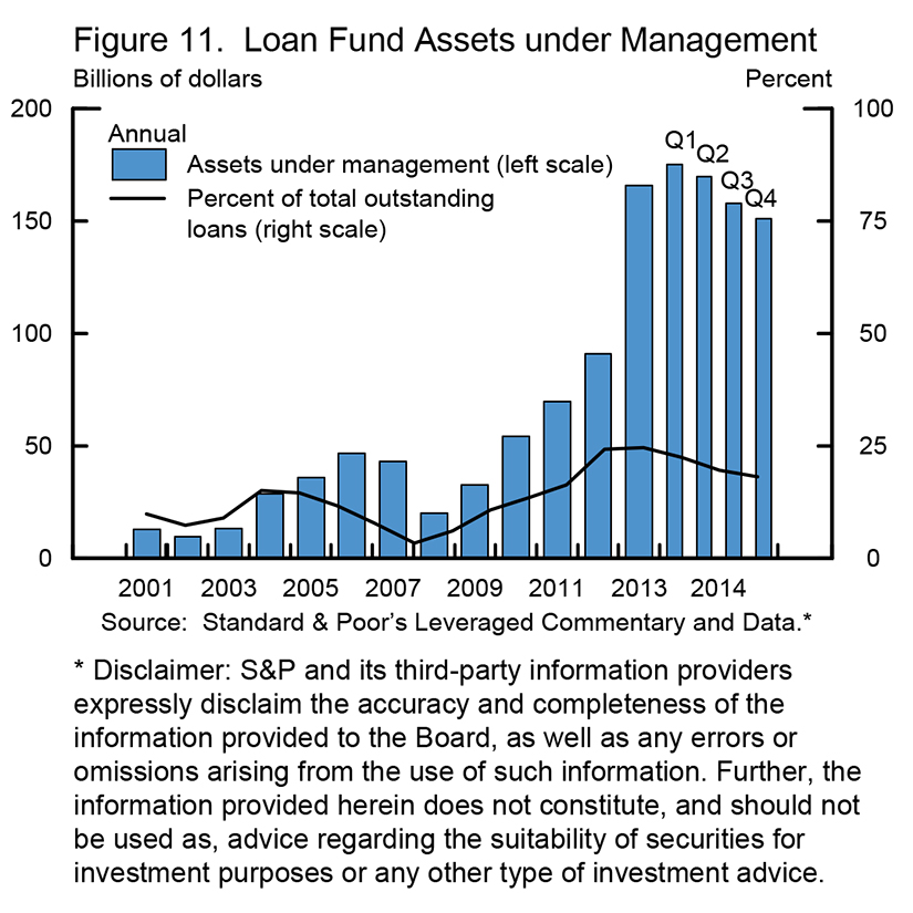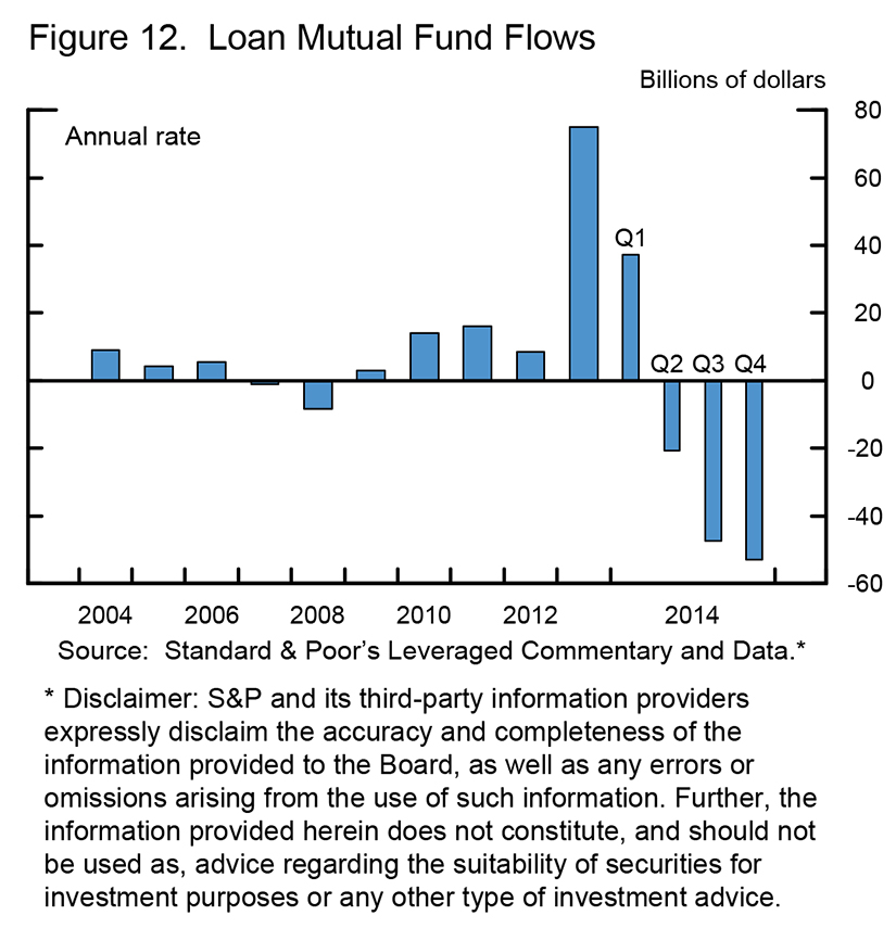 Bank loan funds, which attract retail investors and offer daily liquidity, now total about $150 billion, or 20 percent of institutional leveraged loans outstanding (figure 11). The liquidity transformation provided by these funds has not created problems so far despite recent outflows from bank loan funds, but supervisors and market participants have raised valid concerns that stressful times could well bring large-scale redemptions and threaten runs (figure 12). Chair Mary Jo White has made liquidity concerns regarding open-ended mutual funds a priority for the SEC.13