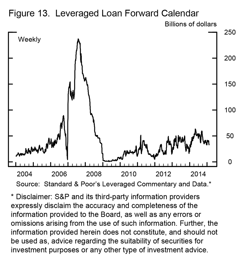 While some of these conditions evoke the pre-crisis bubble period and thus raise red flags, there are important differences as well. The large institutions that arrange these loans have significantly reduced both the size and duration of their leveraged loan commitments (figure 13). Thus, they are not exposed to the large "pipeline risk" they faced as the crisis broke. In addition, banks now routinely limit their risk by including "flex" provisions that, among other things, enable them to increase the interest rate on a loan offered for sale by 150 basis points or more, at the borrower's expense. So far, we have not seen the very large transactions of the pre-crisis period. In these and other respects, the leveraged finance markets have evolved, probably because of supervision as well as lessons learned by the banks themselves. Given these changes, banks at the core of our financial system seem less likely to experience stress should conditions in leveraged lending deteriorate. Of course, the guidance now stands in the way of a return to pre-crisis conditions.