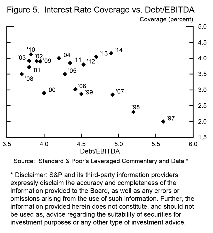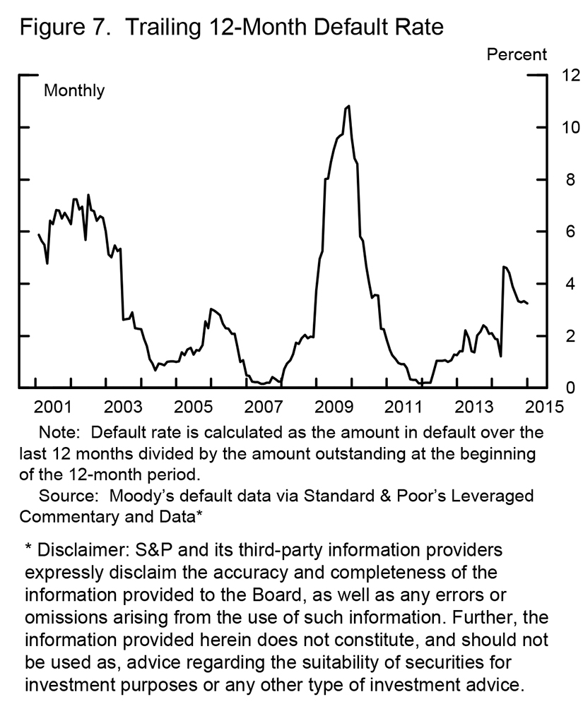 Pre-crisis conditions in leveraged finance markets were, with the benefit of hindsight, clearly in bubble territory. Deal leverage was at historically high levels (figure 3), and spreads were at historic lows (figure 4). Interest coverage ratios were quite low (figure 5). Unusually large leveraged buyouts were common. Banks entered into very large, long duration commitments to fund deals that faced significant regulatory and other requirements before they could close. Estimates vary, but when the crisis emerged and liquidity in these markets evaporated, large dealers were left holding roughly $350 billion in loans and commitments in their pipelines that they could not sell, and these positions remained on banks' balance sheets for a time. As loan values declined an unprecedented 40 percent (figure 6), there were significant mark-to-market losses on these assets, which may have contributed to doubts about the condition of institutions at the core of the system. Subsequent default rates were not outsized by historical standards, and recovery rates were in line with past averages (figure 7). Of course, the Fed's monetary policy eased financial conditions across the economy and enabled the refinancing of many of these loans at lower rates and with issuer-friendly terms.