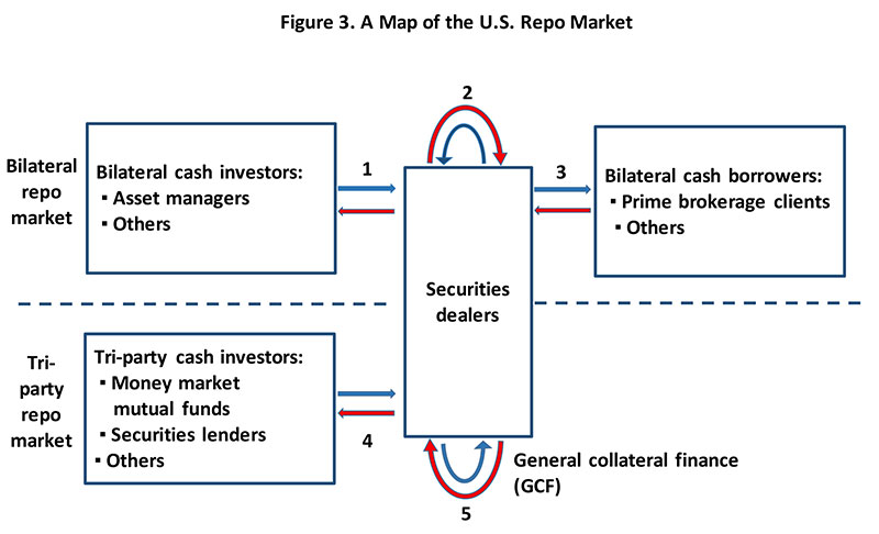 The U.S. repo market is composed of several segments, as illustrated in Figure 3. Dealers are at the center of the figure and operate in all five of the segments shown. In the bilateral market (segments 1 through 3), participants often impose narrow restrictions on the specific securities eligible for collateral. In this portion of the market, cash providers tend to be professional investors such as asset managers (segment 1), or the securities dealers themselves. Cash borrowers include prime brokerage clients (segment 3). Securities dealers may also borrow cash in this market, or may borrow it and then redistribute it to other dealers (segment 2).