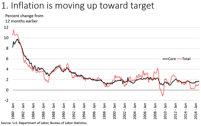 The Federal Open Market Committee (FOMC) has an objective of 2 percent for inflation, as measured by the annual change in the price index for personal consumption expenditures. The Committee sees this objective as symmetrical, so that minor deviations above or below 2 percent are treated alike.1 Inflation has consistently run below 2 percent since 2011, and is now at 1.2 percent over the past 12 months (figure 1). This headline measure of inflation has recently been held down by falling energy and food prices. We also monitor core inflation, which excludes the volatile energy and food components because they often send a misleading signal about underlying inflation pressures. Core inflation is running at 1.7 percent over the past 12 months. Both measures have gradually moved upward toward 2 percent.