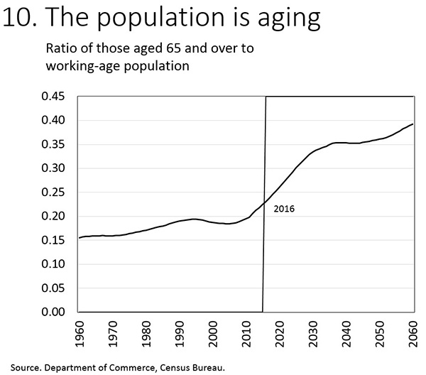 How much of this decline is just a particularly bad business cycle, and how much represents a long-run downshift? To get at that question, let's take a deeper look at the growth slowdown. We can think of economic growth as coming from two sources: more hours worked (labor supply) or higher output per hour (productivity). Hours worked mainly depends on growth in the labor force, which has been slowing since the mid-2000s as the baby-boom generation ages. As you can see, the labor force is now growing at only about 0.5 percent per year (figure 9). Another way to see this is through the sustained increase in the ratio of people over 65 to those who are in their prime working years (figure 10). This long-expected demographic fact has now arrived, and it has challenging implications for our potential growth and also for our fiscal policy.4