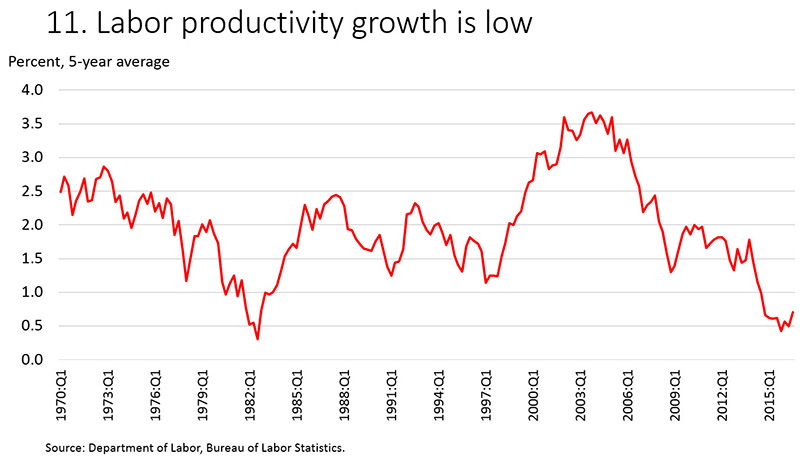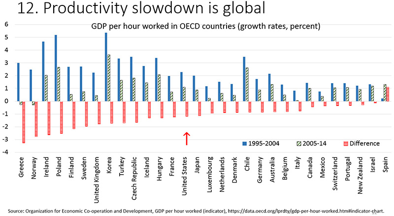 The unexpected part of the growth slowdown reflects weak productivity growth rather than lower labor supply. Labor productivity has increased only 1/2 percent per year since 2010--the smallest five-year rate of increase since World War II and about one-fourth of the average postwar rate (figure 11). The slowdown in productivity has been worldwide and is evident even in countries that were little affected by the crisis (figure 12). Given the global nature of the phenomenon, it is unlikely that U.S.-specific factors are mainly responsible.