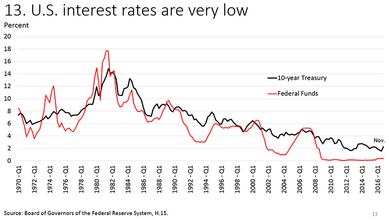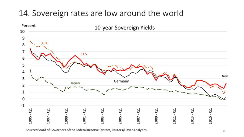 Let's turn to the related question of why long-term interest rates are so extraordinarily low in advanced economies around the world. The yield on our own benchmark 10-year U.S. Treasury security has increased lately, but at 2.3 percent it is still far below what was normal before the financial crisis. In fact, this next chart shows that, as growth and inflation have fallen, longer term interest rates have fallen as well over the past 35 years (figure 13).