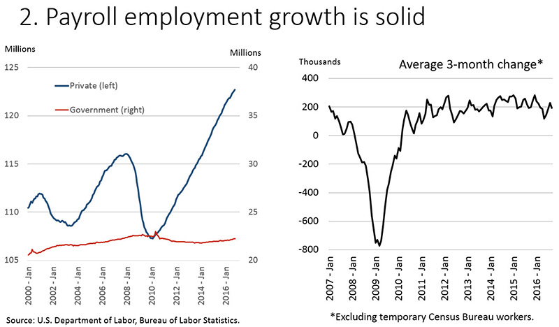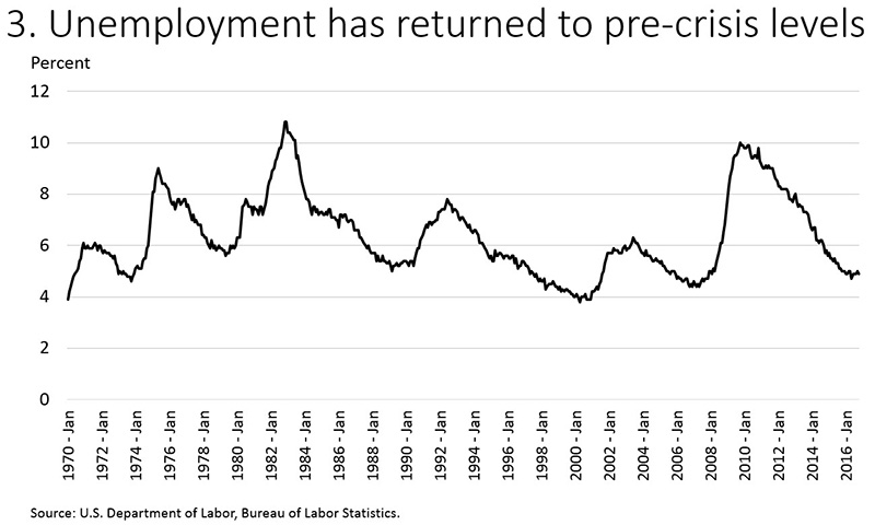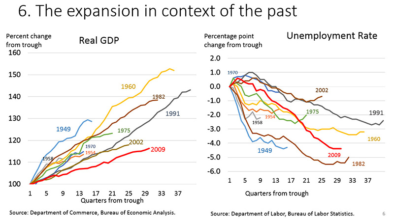 It is interesting to compare this expansion to past U.S. expansions, and also to recoveries of other countries since the end of the Global Financial Crisis. The picture is a mixed one. The current recovery has been under way since June 2009--nearly seven and a half years. It will soon be the third longest of the 20 recoveries since the founding of the Federal Reserve in 1913. GDP, or output, is now 11 percent higher than its pre-crisis peak. Employment is now 6.5 million higher than its pre-crisis peak.