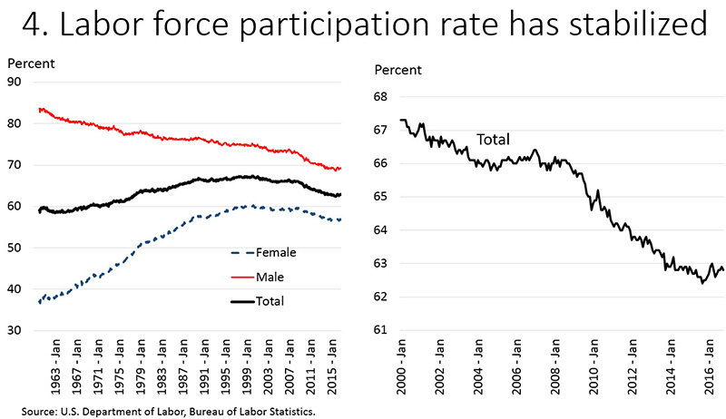 The labor force participation rate represents the percentage of adults aged 16 and over who are in the labor force, which is defined to include only those who are employed or actively looking for work. When people enter or reenter the labor force and begin to search for a job, that is generally a good thing even though at the margin their entry tends to increase the unemployment rate (or prevent it from declining). Beginning in the 1960s, labor force participation rose steadily as women entered the paid workforce (figure 4). That trend ran its course as participation peaked around 2000 and has declined steadily since then as a result of the aging of our population and other longer-run trends, notably the decline in participation by men in the heart of their working-age years. Going forward, many analysts expect labor force participation to decline at a trend rate of roughly 0.3 percent per year as a result of these factors. However, participation fell much more sharply than that after the financial crisis. Some of those who left the labor force went back to school, but others moved onto disability, took early retirement, or just became discouraged and stopped seeking work. The sharp drop raised fears that the crisis might leave behind permanent damage to our labor force. Fortunately, since late 2013, the participation rate has remained about flat and thus has gradually moved back close to its estimated longer-term trend.2 On net, people have been entering and remaining in the labor market as job prospects have brightened, offsetting the natural decline from population aging.