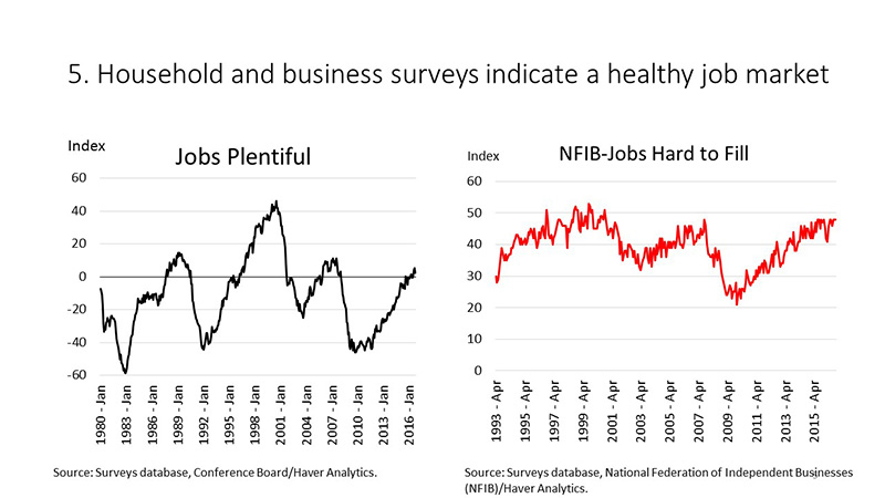 Surveys of households and firms also suggest that we are near full employment (figure 5). For example, respondents are now more likely to say that jobs are plentiful than that they are hard to get--a response that has generally been seen when the economy is near full employment. Job vacancies are running at high levels, and firms report that it is getting harder to find employees to fill open positions. Moreover, wages are now rising faster than inflation, and faster than output per hour. Taken together, labor market indicators show an economy that is on solid footing and close to our mandate of maximum employment.