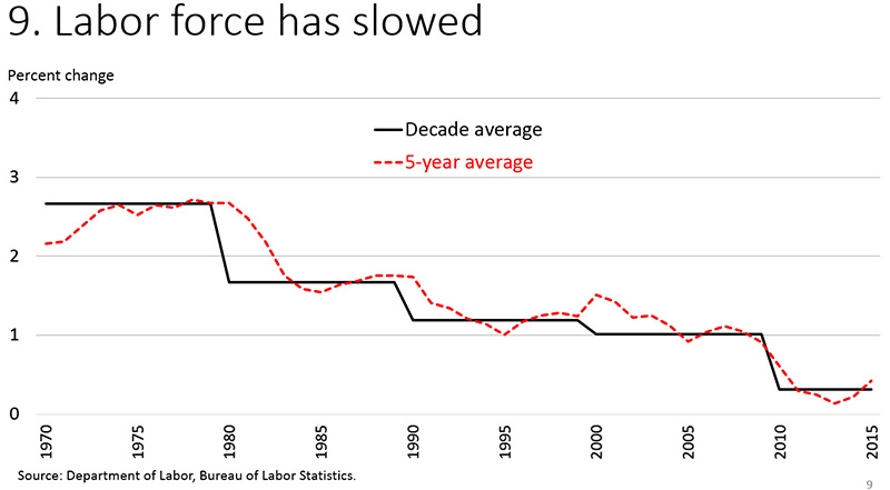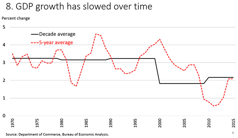 Let's turn to longer-run challenges, and start by asking why growth has been so slow, and how fast we are likely to grow going forward. This next slide shows the five-year trailing average annual real GDP growth rate (figure 8). By this measure, growth averaged about 3.2 percent annually through the 1970s, the 1980s, and the 1990s. But growth began to decline after 2000 and then nose-dived with the onset of the Global Financial Crisis in 2007 and the slow expansion that followed. Since the financial crisis ended in 2009, forecasters have gradually reduced their estimates of long-run trend growth from about 3 percent to about 2 percent--a seemingly small difference that would make a huge difference in living standards over time.3