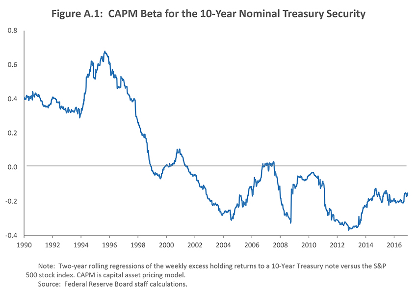 4. The changing risk profile of nominal Treasury bonds can be seen from its capital asset pricing model (or CAPM) beta, a measure of the co-movement between returns on longer-term Treasury securities and the equity market. Figure A.1 shows that the estimated rolling beta of the 10-year Treasury note with respect to the S&P 500 turned from positive to negative around 2000, indicating that Treasury bonds are now likely to act as a safe haven, performing well when equity markets do poorly. Return to text