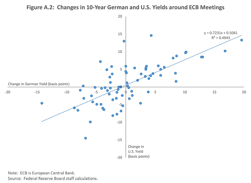 5. Figure A.2 shows the response in daily changes in 10-year U.S. Treasury yields to changes in 10-year German bund yields around European Central Bank (ECB) monetary policy decisions since 2010. The significantly positive regression coefficient is evidence of substantial spillovers from ECB monetary policy to U.S. long-term yields. Return to text