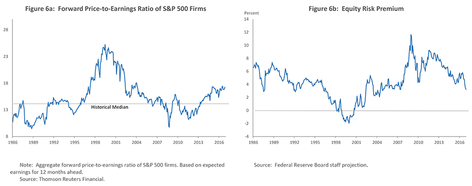 Low rates have provided support for asset valuations--indeed, that is part of their design. But I do not see valuations as significantly out of line with historical experience. Equity prices have recently increased considerably, pushing the forward price-earnings ratio further above its historical median (slide). And equity premiums (right)--the expected return above the risk-free rate for taking equity risk-- have declined, but are not out of line with historical experience.