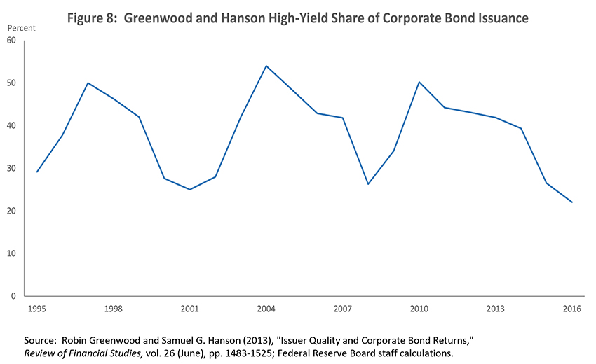 In the nonfinancial sector, valuation pressures are most concerning when leverage is high, particularly in real estate markets. Residential real estate valuations have been in line with rents and household incomes in recent years, and the ratio of mortgage debt to income is well below its pre-crisis peak and still declining. In contrast, valuations in commercial real estate are high in some markets.10 And in the nonfinancial corporate sector, gross leverage is high by historical standards. Low long-term rates have encouraged corporate debt issuance at the same time that some regulations, particularly the Volcker rule, have discouraged banks from holding and making markets in such debt. High-risk corporate debt (the sum of high-yield bonds and leveraged loans) grew rapidly in 2013 and 2014 (slide), although growth has declined sharply since then.11 However, firms also are holding high levels of liquid assets, so net leverage is not elevated. Firms have also lengthened their maturity profiles, and interest coverage ratios are high. As the next slide shows, Greenwood and Hanson's measure of the share of high-yield debt in overall issuance is at a relatively low level.12 And this debt is now held more by unlevered investors. Overall, I do not see leveraged finance markets as posing undue financial stability risks. And if risk-taking does not threaten financial stability, it is not the Fed's job to stop people from losing (or making) money.