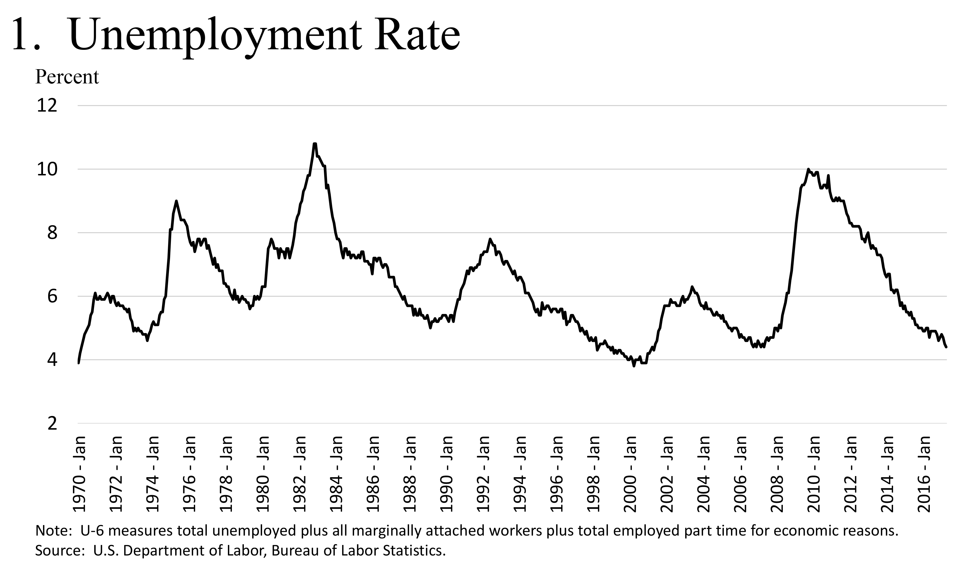 1. For example, the Congressional Budget Office estimates that the natural rate of unemployment is currently 4.7 percent. The March 2017 Blue Chip Economic Indicators reported that the consensus forecast for the unemployment rate over 2024 to 2028 was 4.7 percent, with the top 10 projections averaging 5.1 percent and the bottom 10 averaging 4.3 percent. The median estimate of the longer-run normal rate of unemployment in the March 2017 Summary of Economic Projections was 4.7 percent. The uncertainty around these estimates is large. The canonical paper by Staiger, Stock, and Watson puts the 95 percent confidence interval at 1-1/2 percentage points on either side of the point estimate; see Douglas Staiger, James H. Stock, and Mark W. Watson (1997), "How Precise Are Estimates of the Natural Rate of Unemployment?" in Christina D. Romer and David H. Romer, eds., Reducing Inflation: Motivation and Strategy (Chicago: University of Chicago Press). Return to text