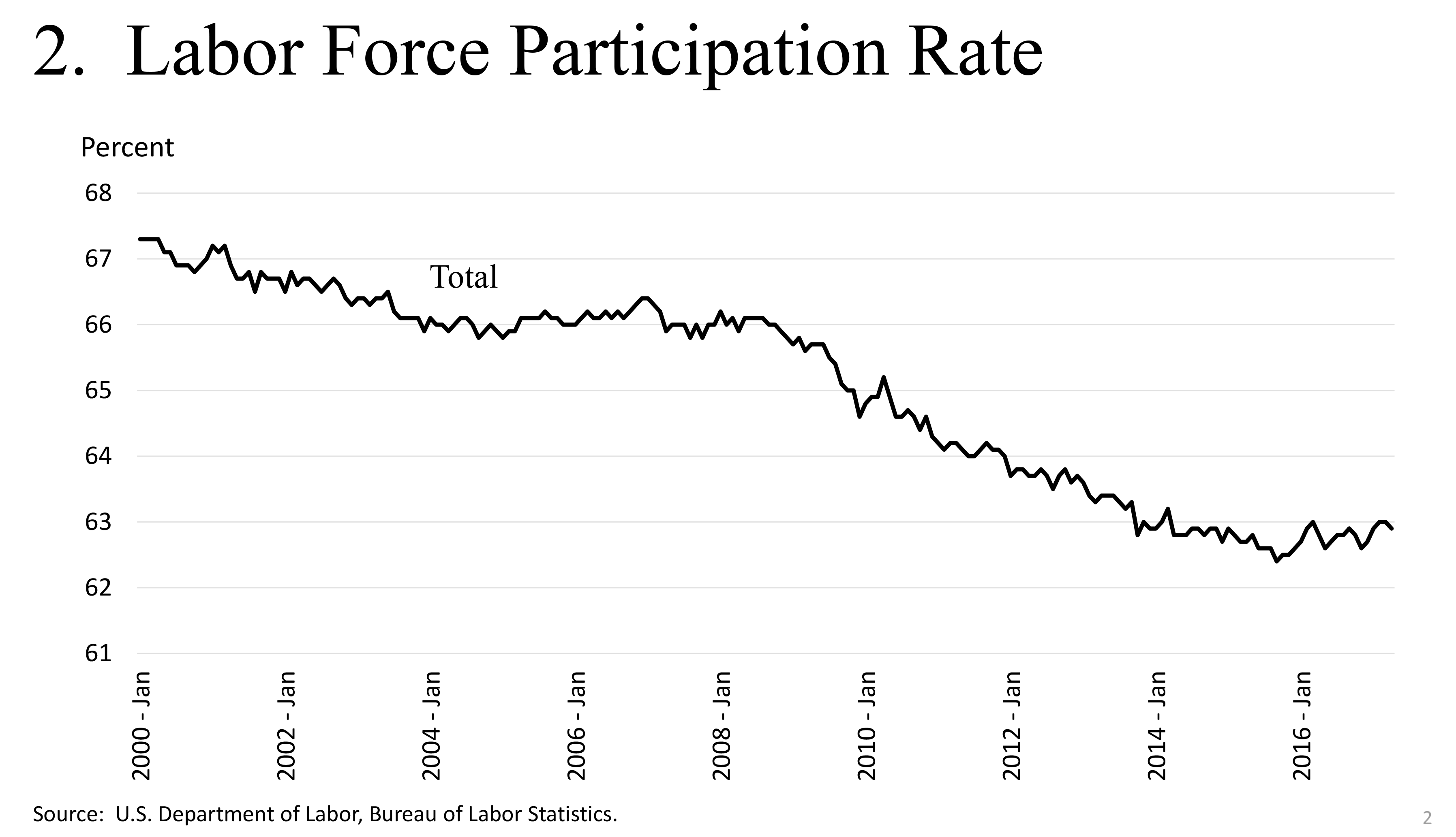 3. The labor force participation rate is currently slightly below the Congressional Budget Office's estimate of trend and slightly above trend estimates based on the methodology of Aaronson and others. See Congressional Budget Office (2017), The Budget and Economic Outlook: 2017 to 2027 (Washington: CBO, January); and Stephanie Aaronson, Tomaz Cajner, Bruce Fallick, Felix Galbis-Reig, Christopher Smith, and William Wascher (2014), "Labor Force Participation: Recent Developments and Future Prospects," Brookings Papers on Economic Activity, Fall, pp. 197-275. Return to text