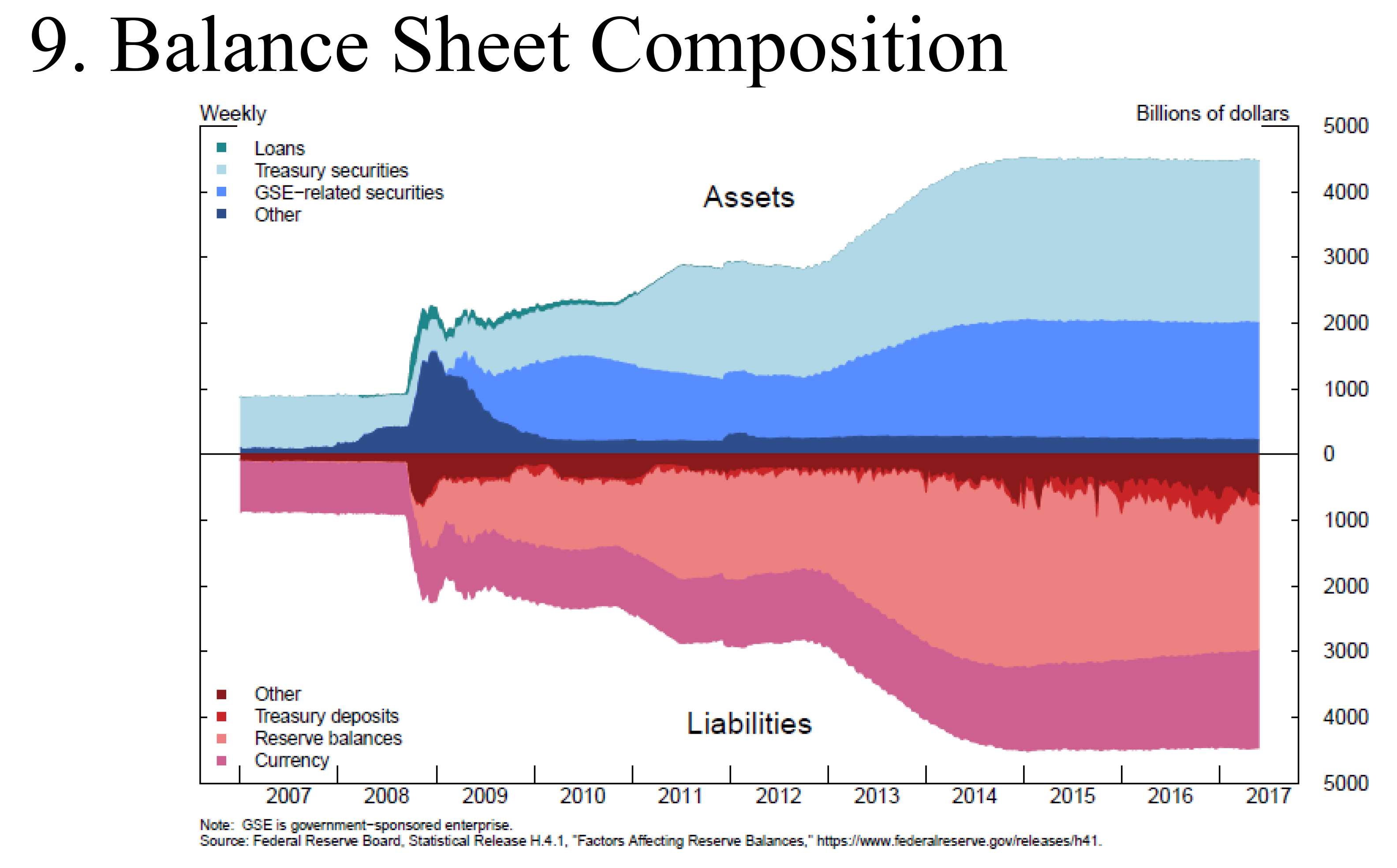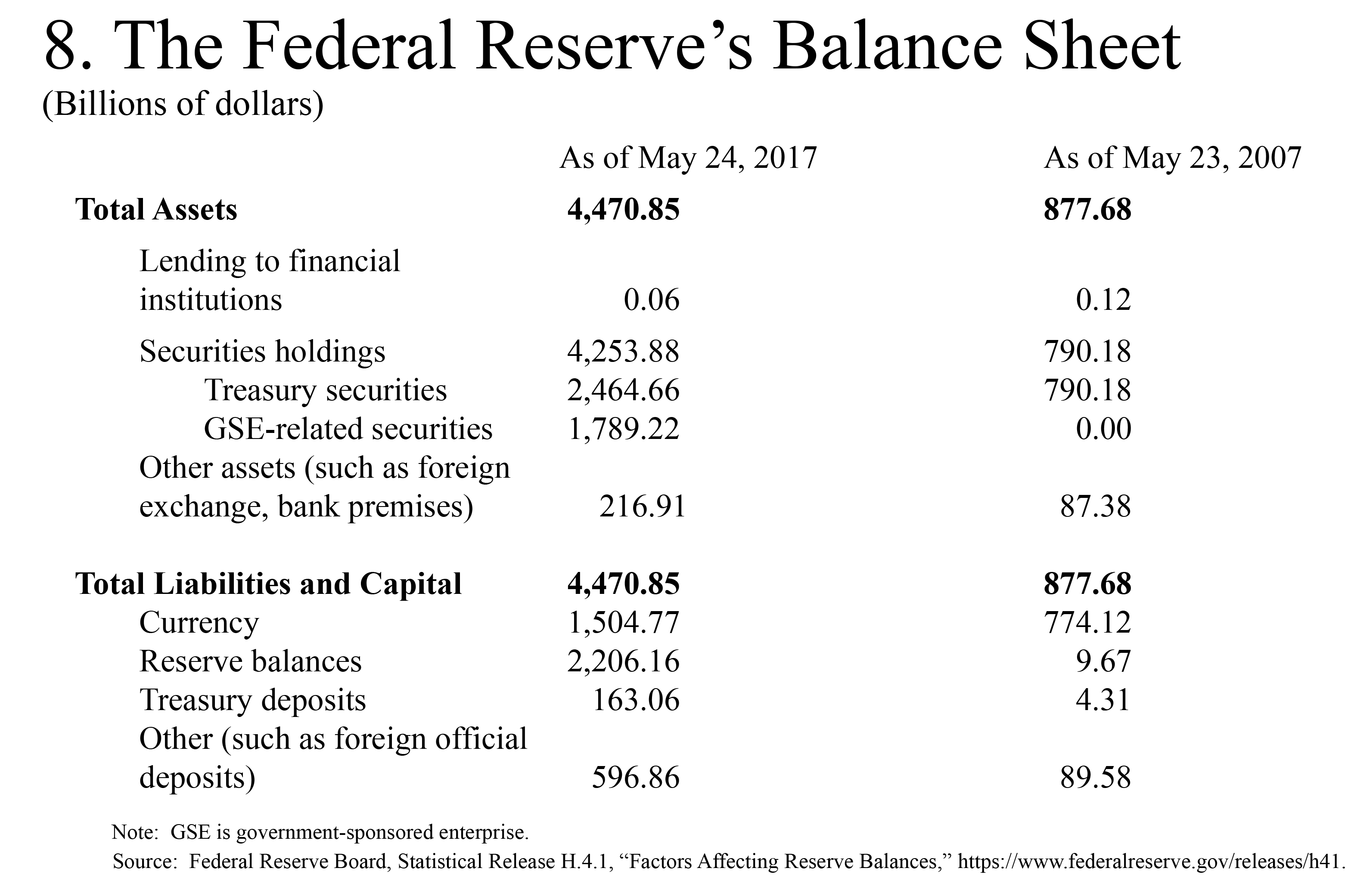 The next slide compares the Fed's balance sheet of May 2007 with that of May 2017 (figure 8). On the asset side, the balance sheet increased by about $3.5 trillion as the FOMC acquired securities in its QE programs. These assets were matched on the liability side of the Federal Reserve's balance sheet by a $2.2 trillion increase in reserve balances held by commercial banks, a $700 billion increase in currency outstanding, and a $500 billion increase in other liabilities.