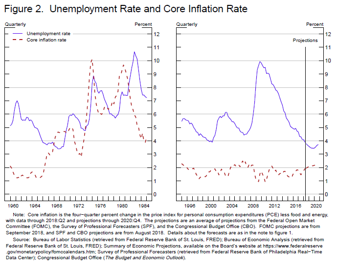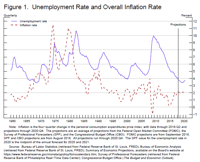 1. I am referring to the most recent forecast for year-end 2018 through 2020. The unemployment rate for each forecast bottoms out at 3.4 percent or 3.5 percent in 2019 and remains below 4 percent. Headline PCE (personal consumption expenditures) inflation is between 1.9 percent and 2.1 percent for all three years and forecasts. The sources for the forecast data are given in the notes to figure 1. Return to text