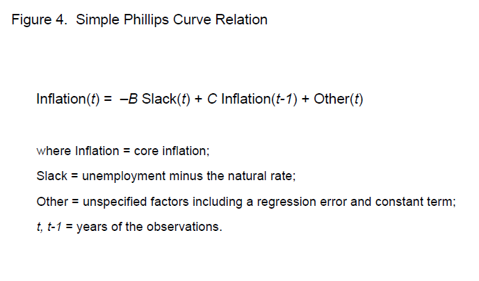 A natural starting point is the simplest form of a Phillips curve equation, which posits that inflation this year is determined by some combination of current labor market slack, inflation last year, and some other factors that I will leave aside for this discussion (figure 4):7