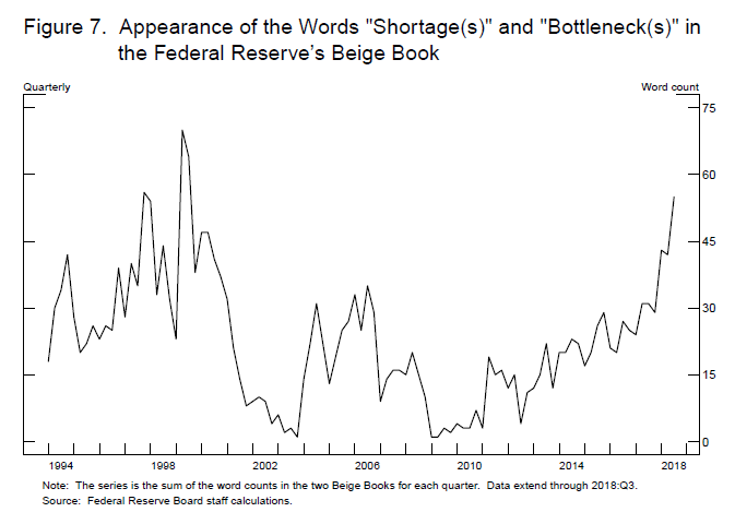 17. The length of the Beige Book has varied somewhat over time; for example, the Beige Book was redesigned in 2017, with the number of words reduced about 10 percent. It is unclear whether the number of important words like "shortage" would have been affected by that redesign, but if so, it would go in the direction of holding down the observed recent increase. Return to text