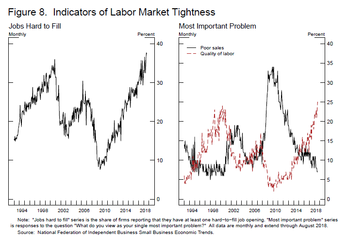 Despite what shows up in the aggregate wage and compensation data, however, I am sure that, like us, many of you are hearing widespread anecdotes about labor shortages and increasing bottlenecks in production. For example, as shown in figure 7, the words "shortage" and "bottleneck" are increasingly appearing in the Beige Book, the Federal Reserve's report summarizing discussions with our business contacts around the country.17 The message we are hearing in our conversations is supported by a wide range of more conventional measures. For example, the survey of members of the National Federation of Independent Business finds firms increasingly reporting that job openings are hard to fill (figure 8). Further, these businesses now list "quality of labor" as their most important problem, as opposed to the more typical report of "poor sales."