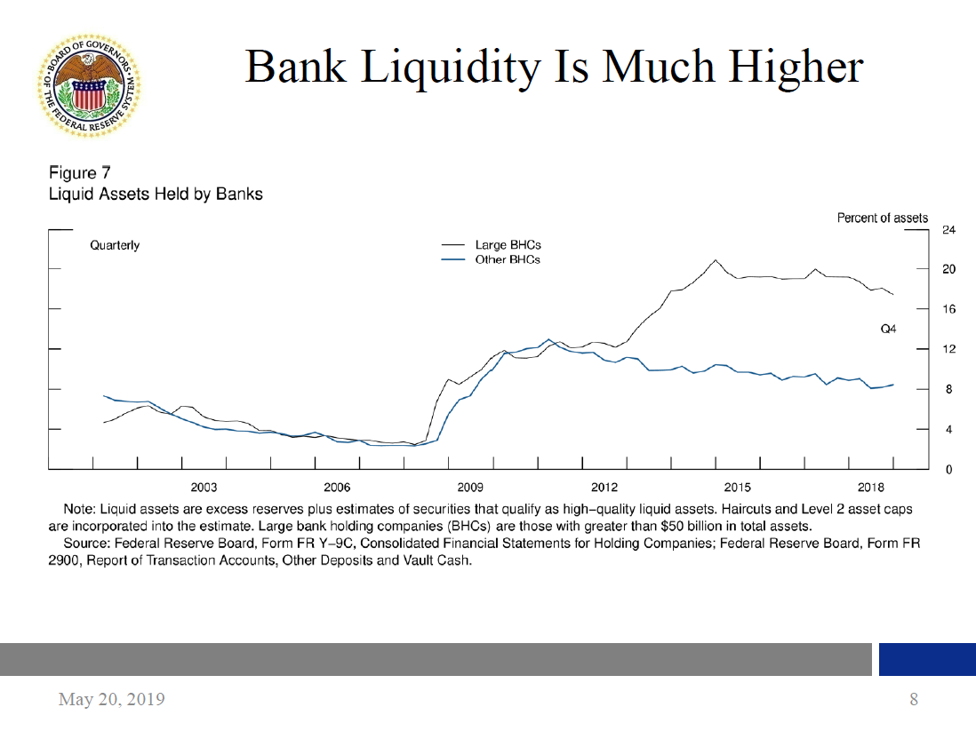 As for our fourth factor—funding risk—the susceptibility of the financial system to runs also appears low. In part because of the post-crisis regulatory regime, large banks hold substantial amounts of highly liquid assets and rely relatively little on short-term wholesale funding (figure 7). Money market funds hold much safer assets. And CLOs, which have facilitated the growth of leveraged loans, have stable funding: Investors commit funds for lengthy periods, so they cannot, through withdrawals, force CLOs to sell assets at distressed prices.
