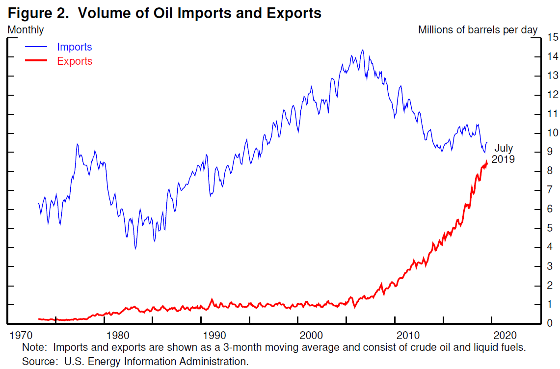Let's turn now to the first question of the consequences of an oil price spike. Figure 1 shows U.S. oil production since 1920. After rising fairly steadily through the early 1970s, production began a long period of gradual decline. By 2005, production was at about the same level as it had been 50 years earlier. Since then, remarkable advances in the technology for finding and extracting oil have led to a rapid increase in production to levels higher than ever before.3 In 2018, the United States became the world's largest oil producer.4 Oil exports have surged, imports have fallen (figure 2), and the U.S. Energy Information Administration projects that this month, for the first time in many decades, the United States will be a net exporter of oil.5