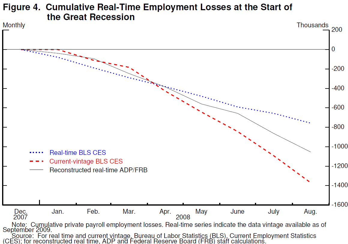 17. Any example about the details of data deserves detailed comment. Our ADP-based estimate showed job losses of about 1 million over this period, considerably more than the real-time BLS data but well short of the post-benchmark value. This episode motivated the BLS to revise their procedures in ways that will reduce the revisions in similar episodes in the future. See BLS (2019) for a technical note last updated in August and BLS (2010). Return to text