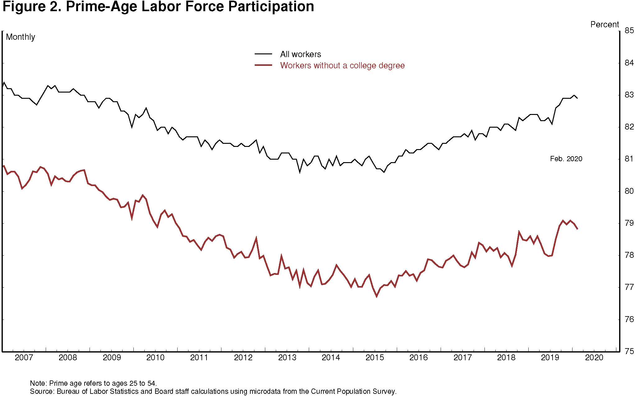 We need only look to February of last year to see how beneficial a strong labor market can be. The overall unemployment rate was 3.5 percent, the lowest level in a half-century. The unemployment rate for African Americans had also reached historical lows (figure 1). Prime-age labor force participation was the highest in over a decade, and a high proportion of households saw jobs as "plentiful."1 Overall wage growth was moderate, but wages were rising more rapidly for earners on the lower end of the scale. These encouraging statistics were reaffirmed and given voice by those we met and conferred with, including the community, labor, and business leaders; retirees; students; and others we met with during the 14 Fed Listens events we conducted in 2019.2