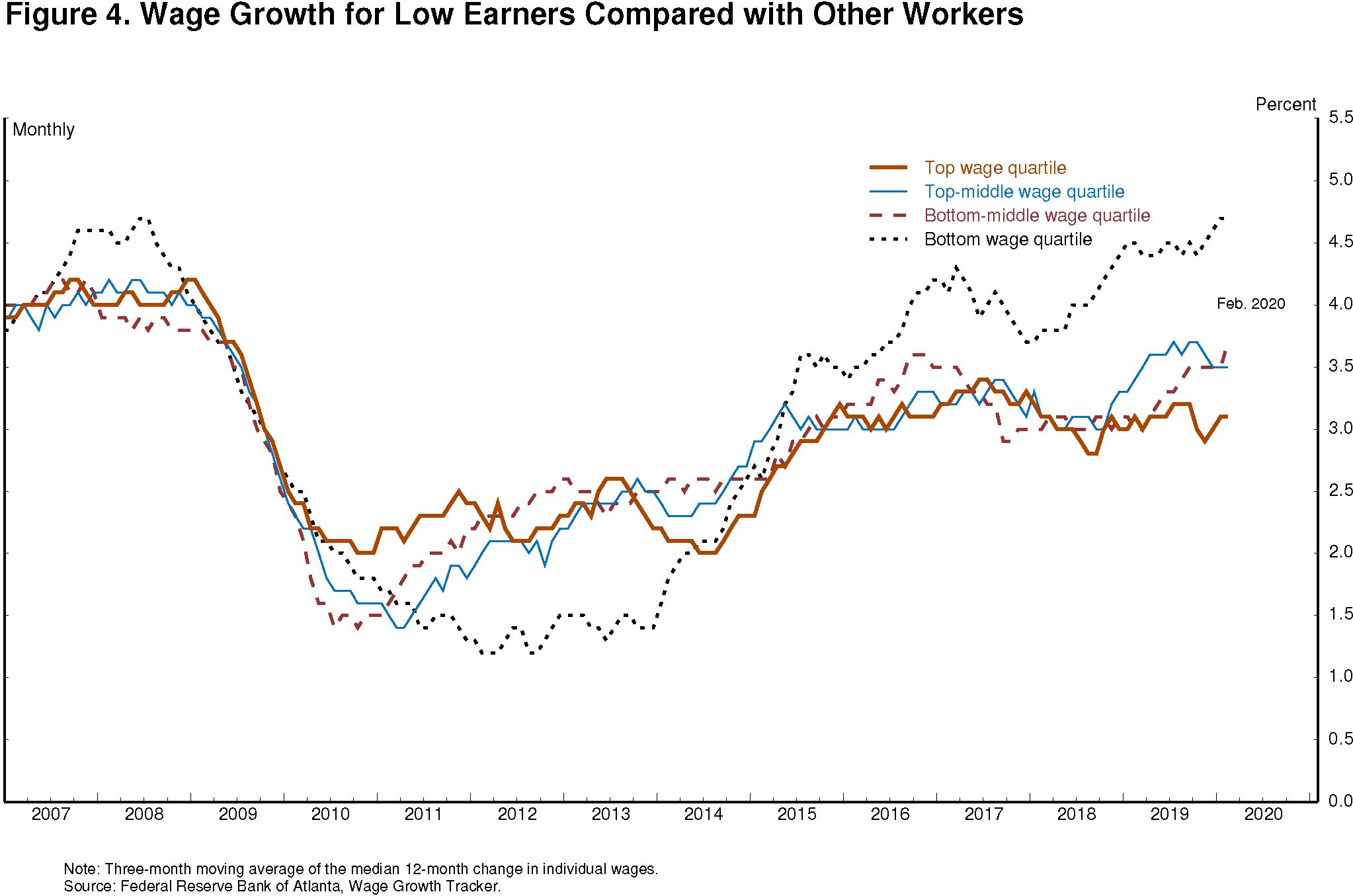 As I mentioned, we also saw faster wage growth for low earners once the labor market had strengthened sufficiently. Nearly six years into the recovery, wage growth for the lowest earning quartile had been persistently modest and well below the pace enjoyed by other workers. At the tipping point of 2015, however, as the labor market continued to strengthen, the trend reversed, with wage growth for the lowest quartile consistently and significantly exceeding that of other workers (figure 4).