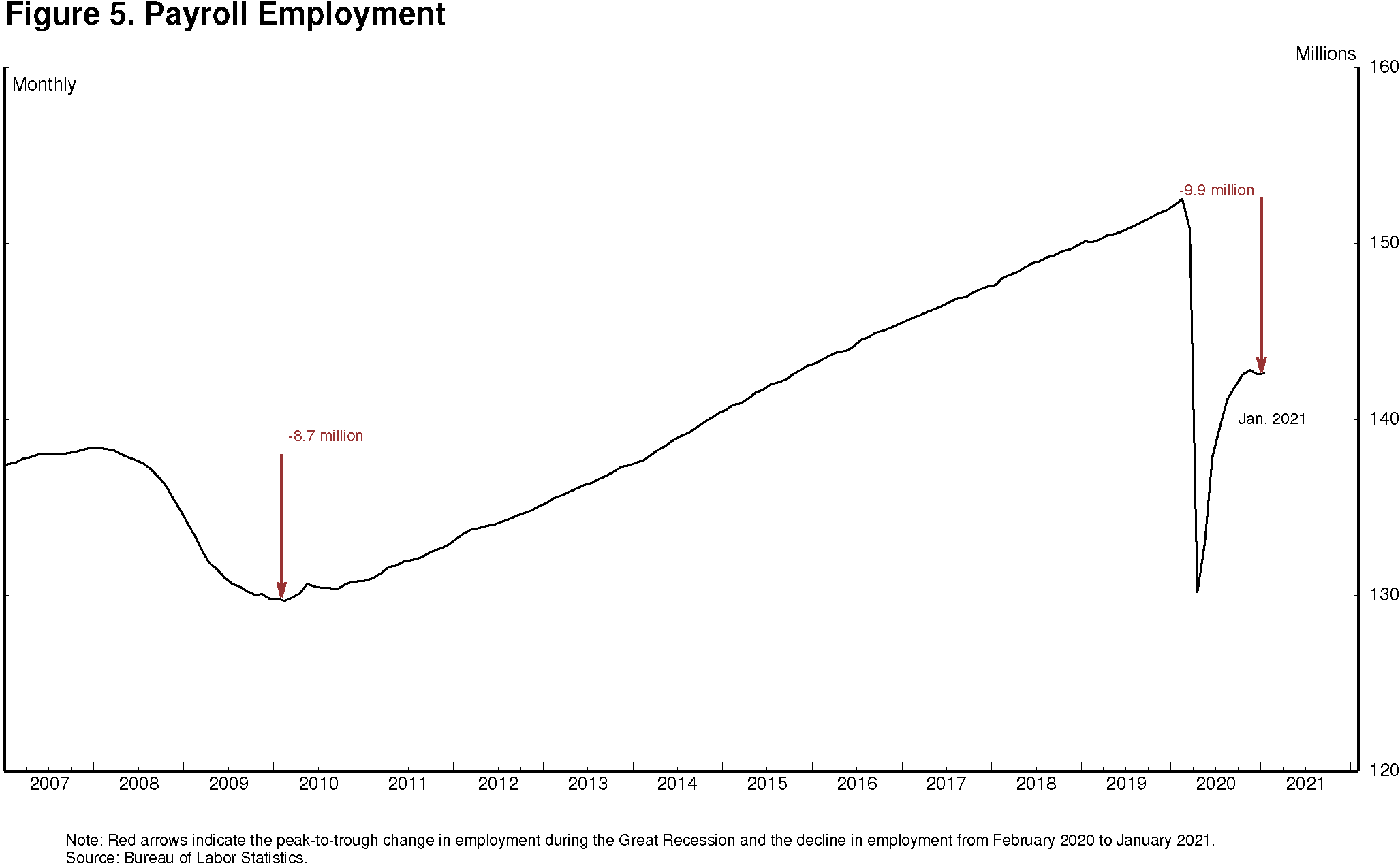 In the past few months, improvement in labor market conditions stalled as the rate of infections sharply increased. In particular, jobs in the leisure and hospitality sector dropped over 1/2 million in December and a further 61,000 in January. The recovery continues to depend on controlling the spread of the virus, which will require mass vaccinations in addition to continued vigilance in social distancing and mask wearing in the meantime.