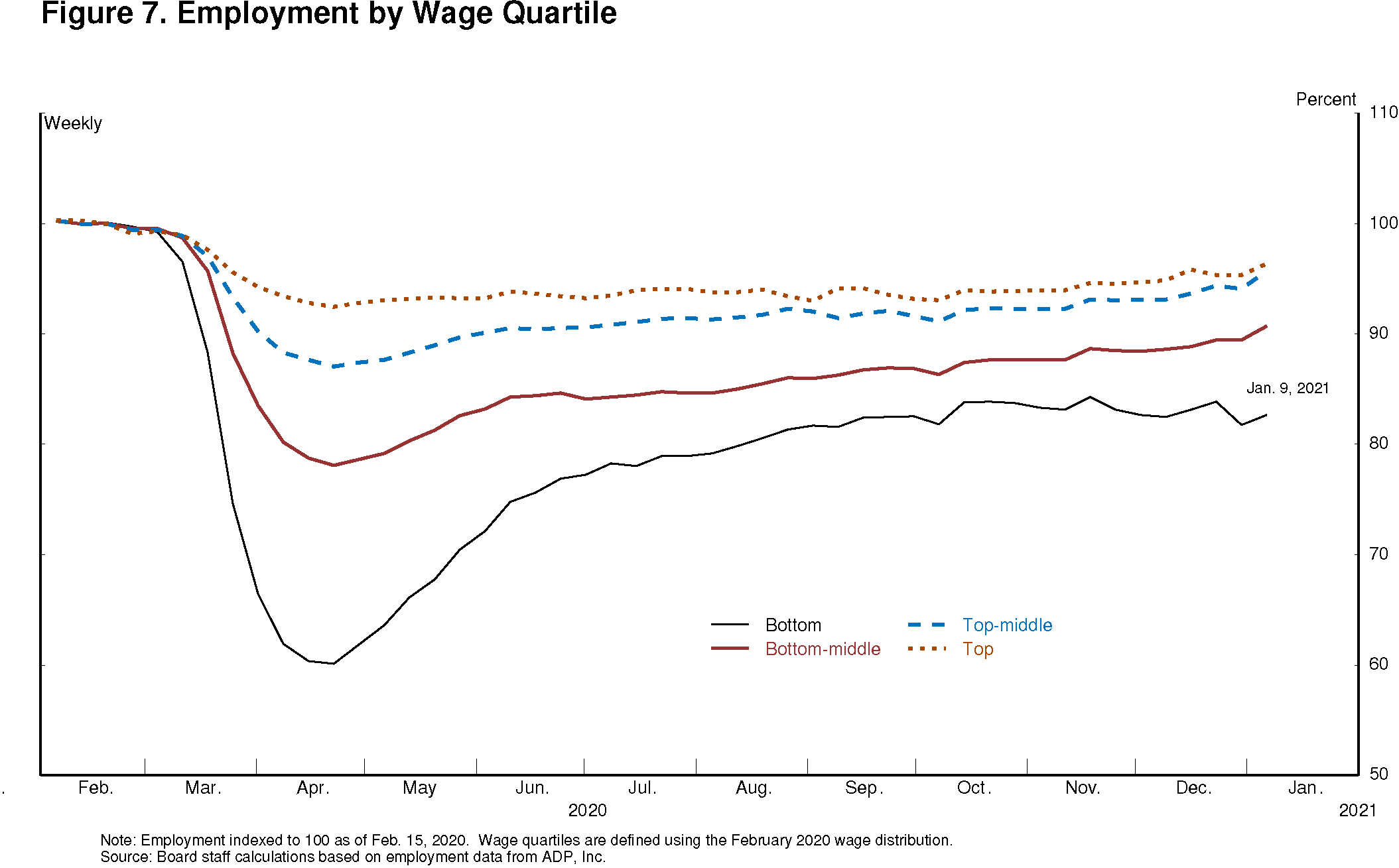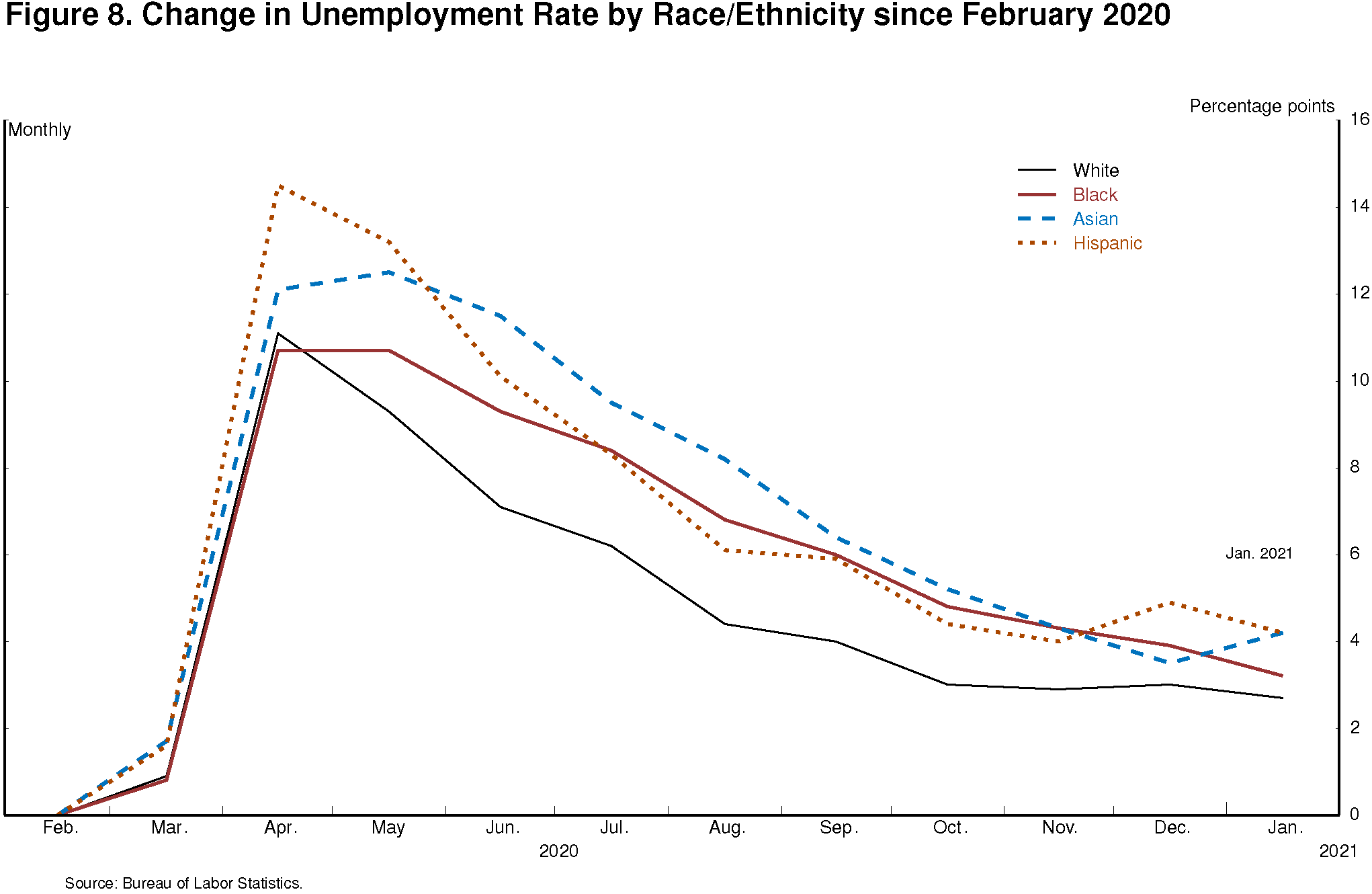 Unfortunately, even those grim statistics understate the decline in labor market conditions for the most economically vulnerable Americans. Aggregate employment has declined 6.5 percent since last February, but the decline in employment for workers in the top quartile of the wage distribution has been only 4 percent, while the decline for the bottom quartile has been a staggering 17 percent (figure 7). Moreover, employment for these workers has changed little in recent months, while employment for the higher-wage groups has continued to improve. Similarly, the unemployment rates for Blacks and Hispanics have risen significantly more than for whites since February 2020 (figure 8). As a result, economic disparities that were already too wide have widened further.