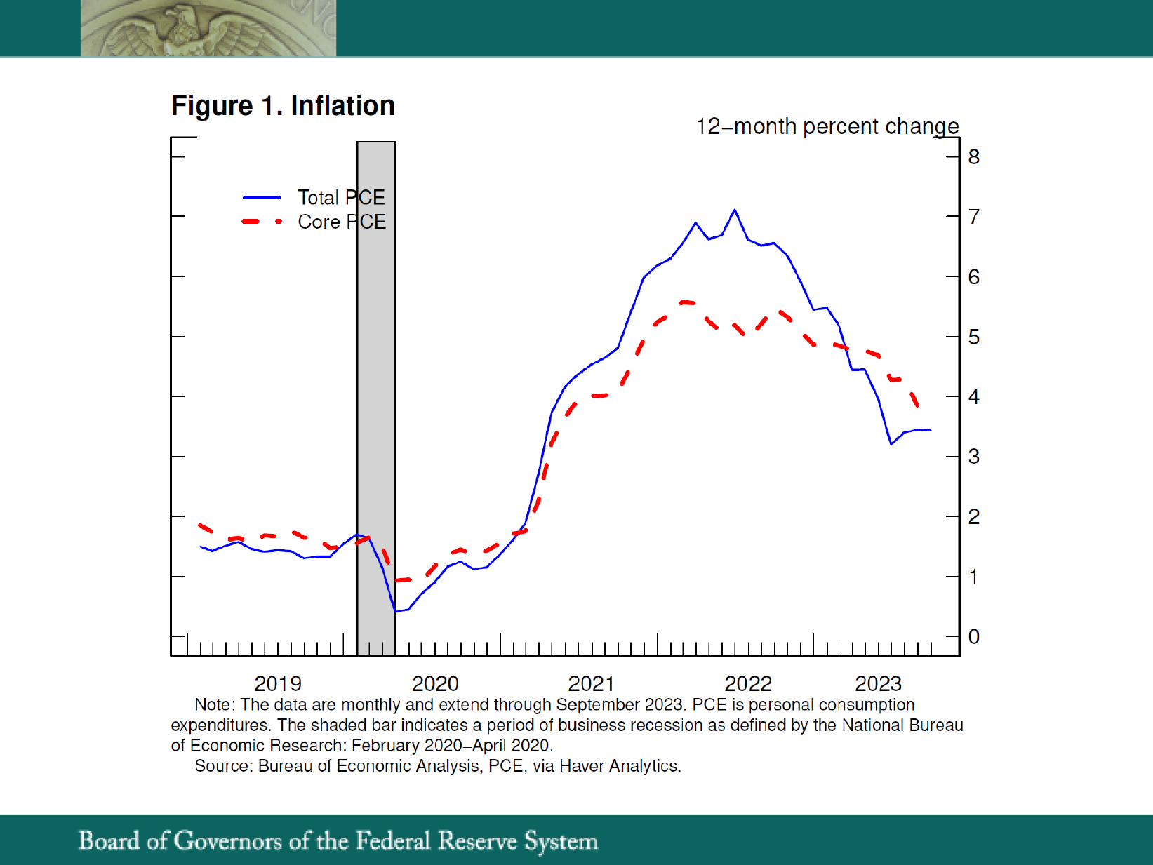1. Inflation under our preferred measure, the 12-month change in the total personal consumption expenditures (PCE) price index, has declined from 6.6 percent in September 2022 to 3.4 percent in September 2023. The 12-month change in the core PCE measure, which excludes the volatile food and energy prices and therefore may provide a better signal of where inflation is headed, has declined from 5.5 percent in September 2022 to 3.7 percent in September 2023. Return to text