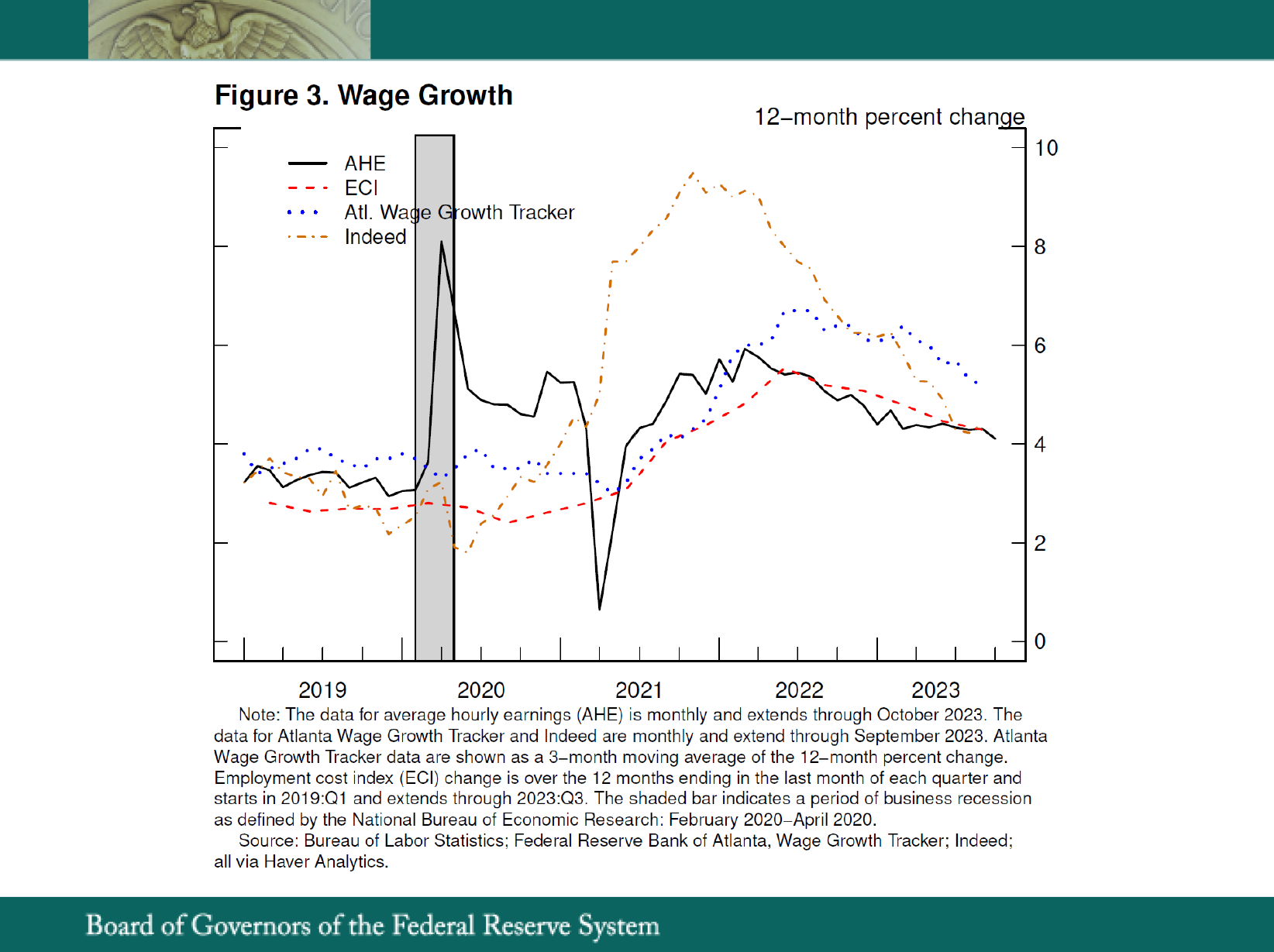 2. The labor force participation rate has moved up since late last year, particularly for individuals aged 25 to 54 years, where that rate has increased by nearly 1 percentage point, on net, since December. Private payrolls increased by an average of 191,000 per month over the 12 months ending in October 2023, down from a rate of 435,000 per month over the 12 months ending in October 2022. Meanwhile, both the quits rate and the wage premium for job switchers have returned to their pre-pandemic ranges. And while they remain above a level that would be consistent with 2 percent inflation in the longer run, broad indicators of 12-month wage growth continue to trend lower. Return to text