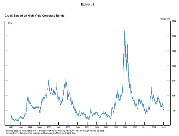 15. To be precise, the spread was at 397 basis points as of January 28, 2013, as compared to a median value of 388 basis points over the period January 1997 to July 2007, and a mean of 447 basis points over the same period. Return to text