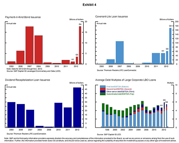 On the other hand, the high-yield share for 2012 was above its historical average, suggesting--based on the results of Greenwood and Hanson--a somewhat more pessimistic picture of prospective credit returns.16 This notion is supported by recent trends in the sorts of nonprice terms I discussed earlier (exhibit 4). The annualized rates of PIK bond issuance and of covenant-lite loan issuance in the fourth quarter of 2012 were comparable to highs from 2007. The past year also saw a new record in the use of loan proceeds for dividend recapitalizations, which represents a case in which bondholders move further to the back of the line while stockholders--often private equity firms--cash out.17 Finally, leverage in large LBOs rose noticeably, though less dramatically, in the third and fourth quarters of 2012.
